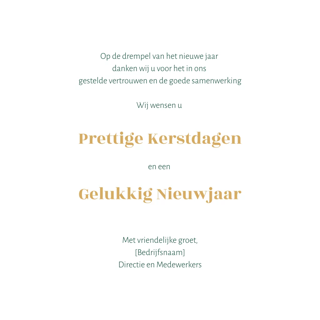 Op deze vierkante, sfeervolle kerstkaart kunt u uw logo plaatsen. Om het logo heen staan feestelijke beelden van kerstbomen en champagne glazen plus het jaar 2026. Een mooie kaart om al uw klanten, medewerkers of andere zakelijke contacten een prettig nieuwjaar mee toe te wensen. Personaliseer de kaart met een kerstwens aan de binnenzijde.