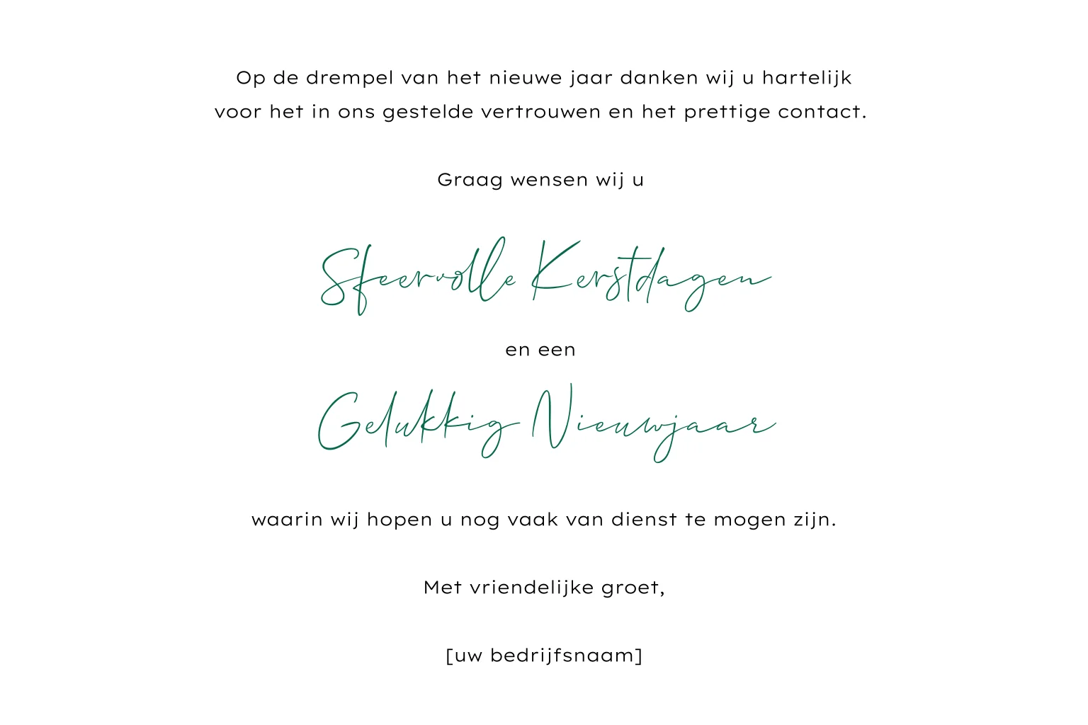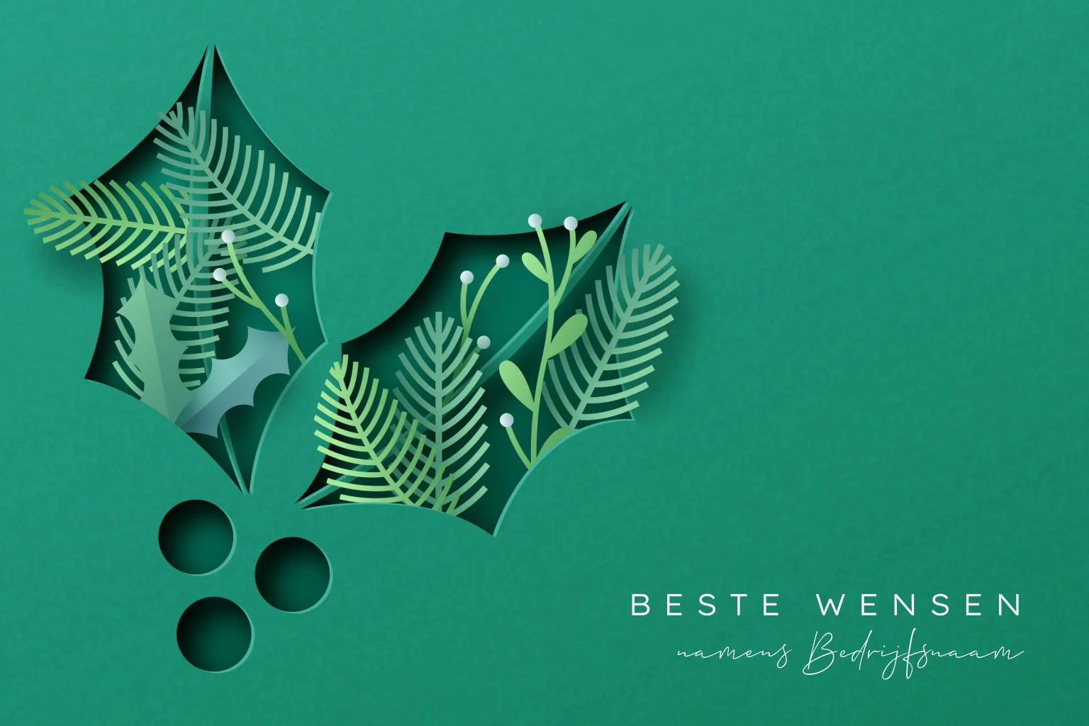 Een groene kerstkaart met grafische illustratie van hulst, geknipt uit papier. Een mooi ontwerp om naar uw zakelijke contacten te versturen. Pas de lettertypes eventueel aan in onze handige ontwerptool.