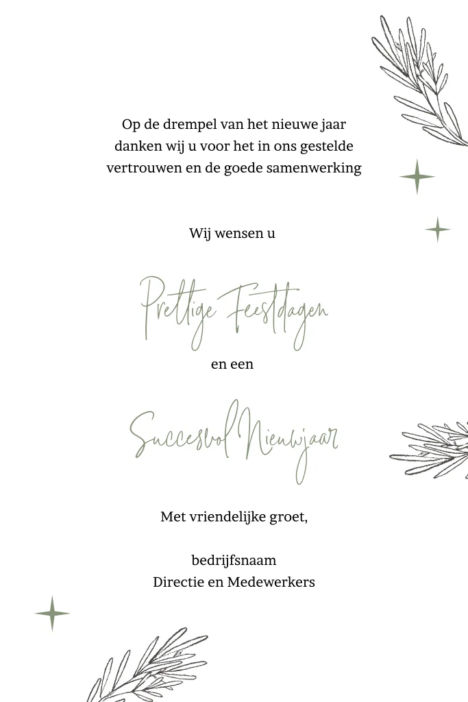 Een zakelijke kerstkaart in zachtgroen met ruimte voor een eigen foto. In onze ontwerptool kunt u eenvoudig zelf de foto vervangen die in het kerstboom fotokader komt te staan. De getekende takjes en sterretjes geven deze kerstkaart een feestelijke en speelse sfeer. Wens je zakelijke contacten of klanten een succesvol nieuwjaar met dit unieke ontwerp.