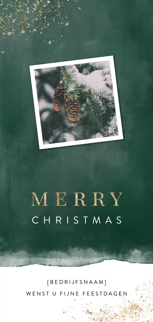 Stijlvolle kerstkaart met donkergroene waterverf, eigen foto en gouden spetters. Wil je jouw zakenrelaties een mooie kerstkaart toesturen als dank voor de fijne samenwerking dit jaar? Kies dan voor dit chique ontwerp met donkergroene waterverf en goudkleurige spetters. In de kaart is ruimte voor het logo en een persoonlijk bericht. Deze kaart is ook verkrijgbaar in het rood en groen en met en zonder foto.