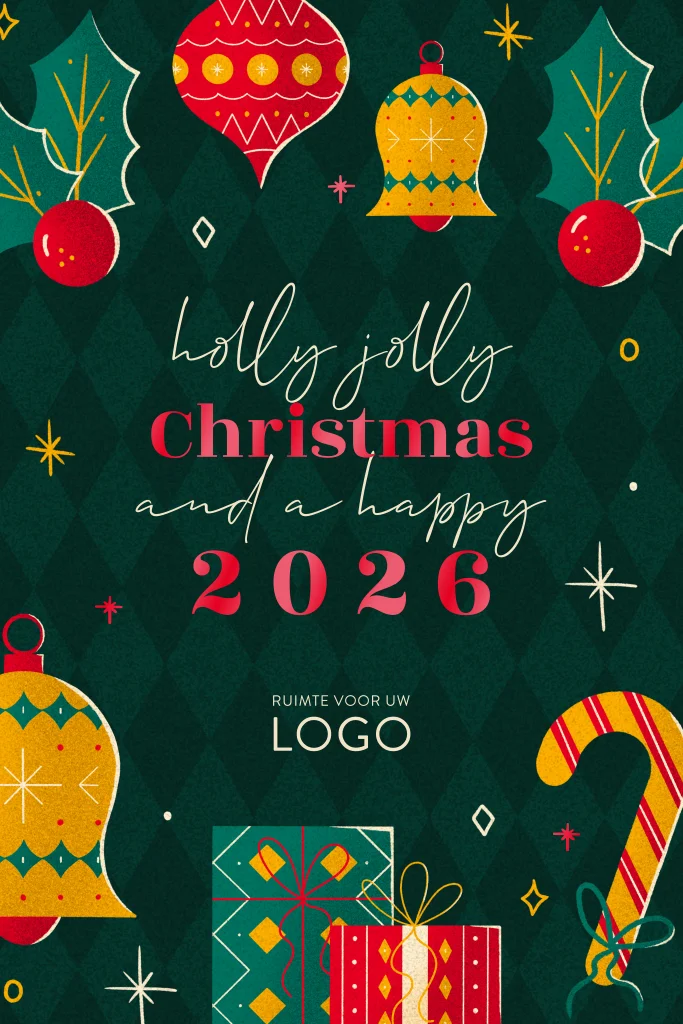 Vrolijk ontwerp met hoogglans typografie om uw zakelijke contacten een gezellige kerst mee toe te wensen. De kaart wordt versierd door grafische tekeningen van hulst, kerstklokjes en cadeautjes. Er is ook ruimte voor uw eigen logo voorop de kaart. Een feestelijk en warm ontwerp! Liever goudfolie? Of de lettertypes wijzigen? Dat kan! Pas deze kerstkaart zelf aan in onze handige editor.