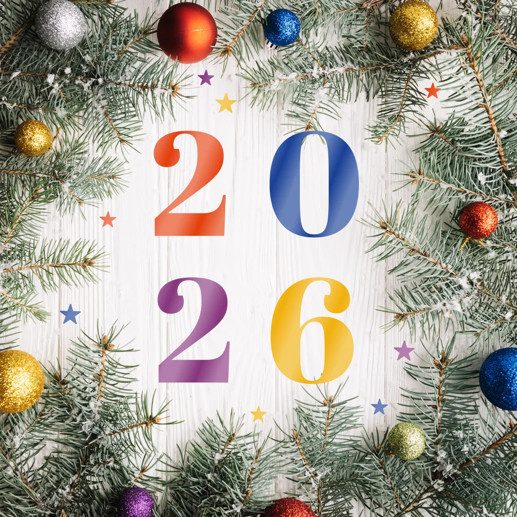 Hoogglans kerstkaart met kerstballen en kleurrijk 2026