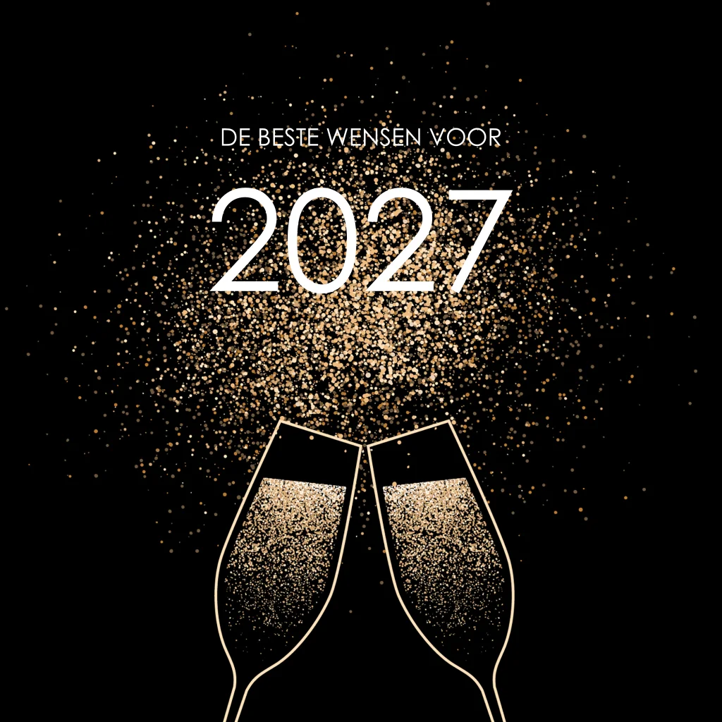 Stijlvolle kerstkaart op vierkant formaat. Deze kaart heeft een diepzwarte achtergrond en goudkleurige glitters. U ziet een illustratie met twee klinkende champagneglazen voorop. Het jaartal 2027 staat met grote cijfers in het midden van alle confetti. In de kaart is ruimte voor een persoonlijke tekst en kunt u hier uw logo plaatsen.