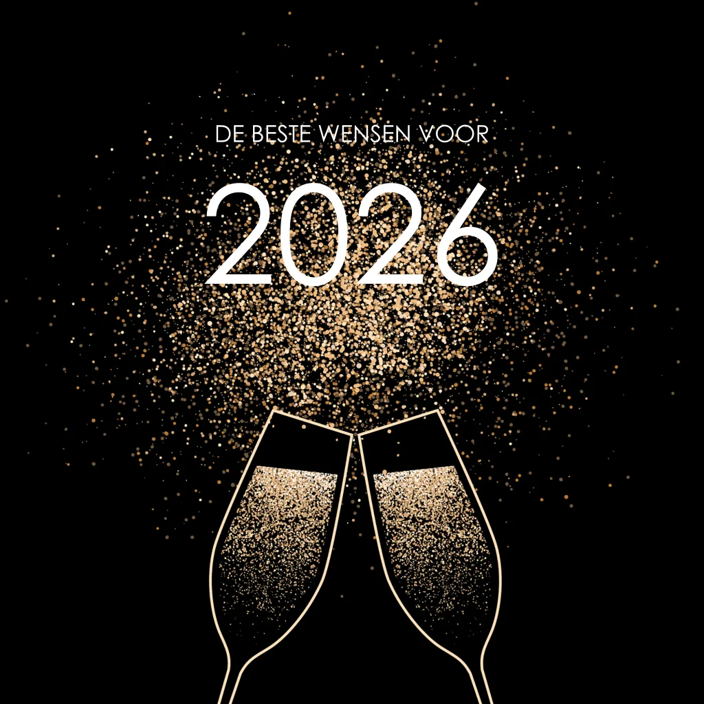 Stijlvolle kerstkaart op vierkant formaat. Deze kaart heeft een diepzwarte achtergrond en goudkleurige glitters. U ziet een illustratie met twee klinkende champagneglazen voorop. Het jaartal 2026 staat met grote cijfers in het midden van alle confetti. In de kaart is ruimte voor een persoonlijke tekst en kunt u hier uw logo plaatsen.