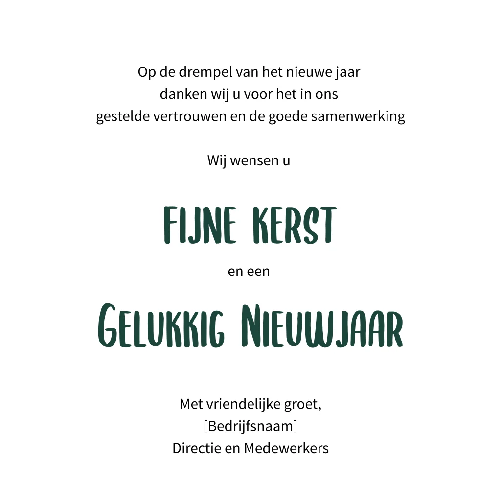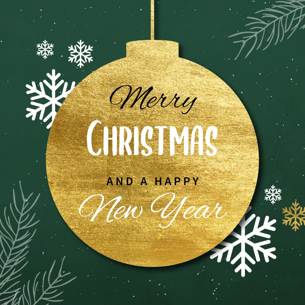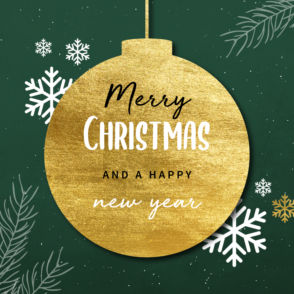 Groene kerstkaart met goudkleurige kerstbal en sterren. Mooie donkergroene kerstkaart om naar uw zakenrelaties te versturen. Dit luxe ontwerp heeft een grote goudkleurige kerstbal op de voorkant met de tekst 'merry christmas and a happy new year'. Pas het ontwerp naar wens aan. Zo kunt u bijvoorbeeld aan de binnenzijde kleuren en teksten aanpassen of een foto toevoegen.