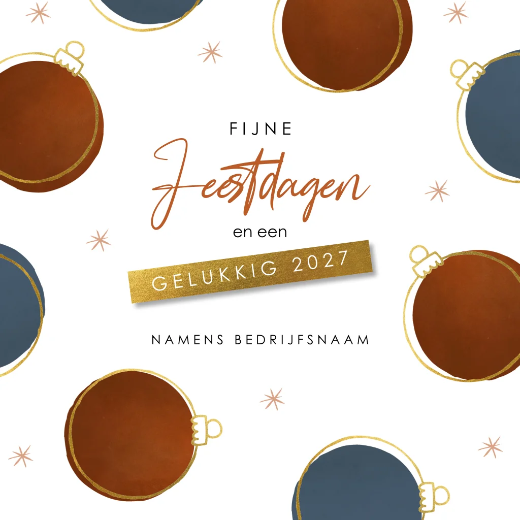 Op zoek naar een hippe kerstkaart om naar uw werknemers en zakenrelaties te sturen? Deze witte kerstkaart met kerstballen in blauw en roestrood en vrolijke typografie is daar perfect voor. De kleine sterretjes en gouden details maken de kaart helemaal af. Pas de kaart gemakkelijk aan in onze handige designtool.