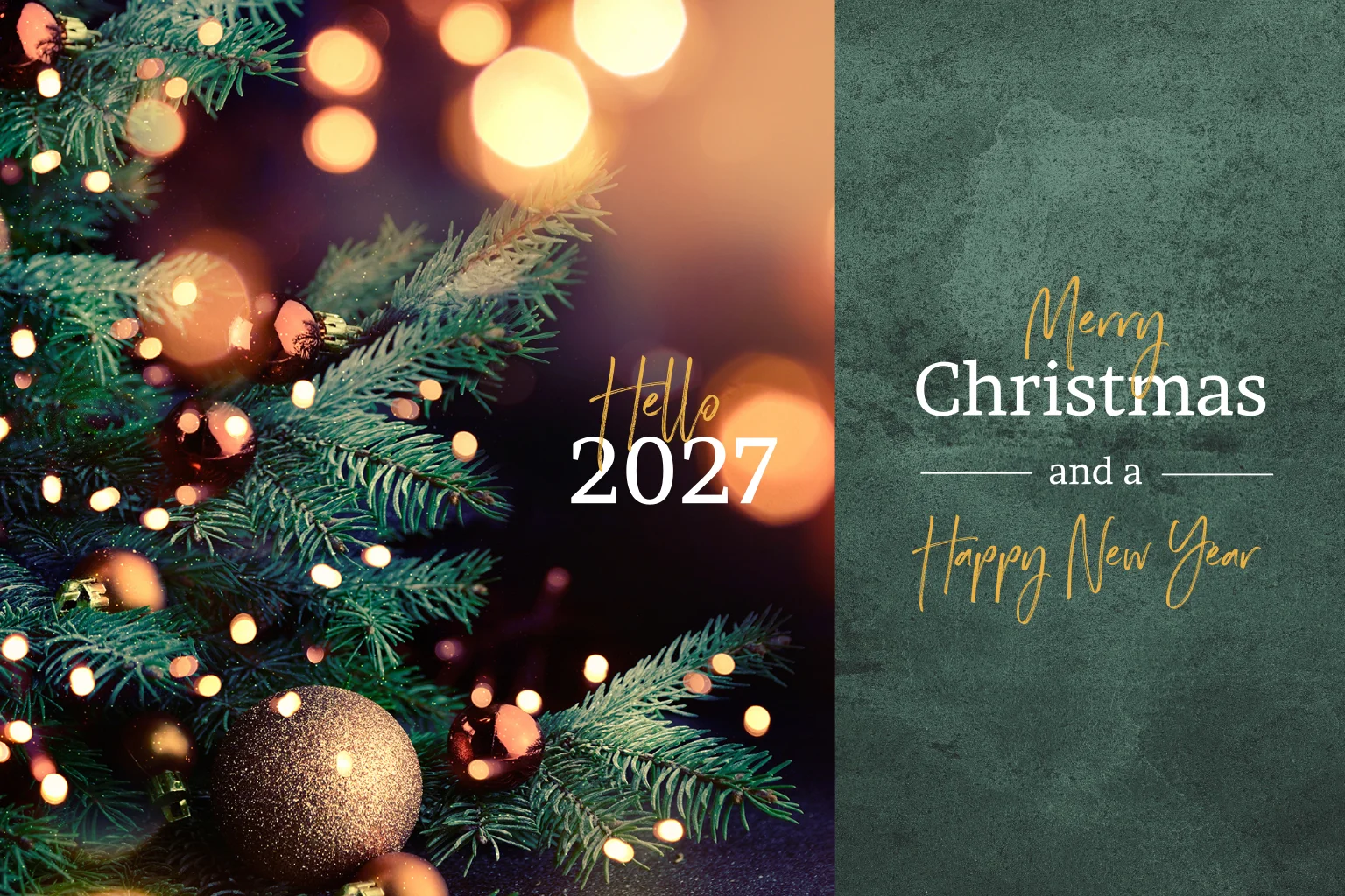 Zakelijke kerstkaart met groene waterverf en sfeervolle foto met kerstboom. Hello 2027! Deze unieke zakelijke kerstkaart is een feestje om te sturen naar je zakenrelaties. Heb je zelf een mooie foto? Deze kun je in de designtool eenvoudig aanpassen.