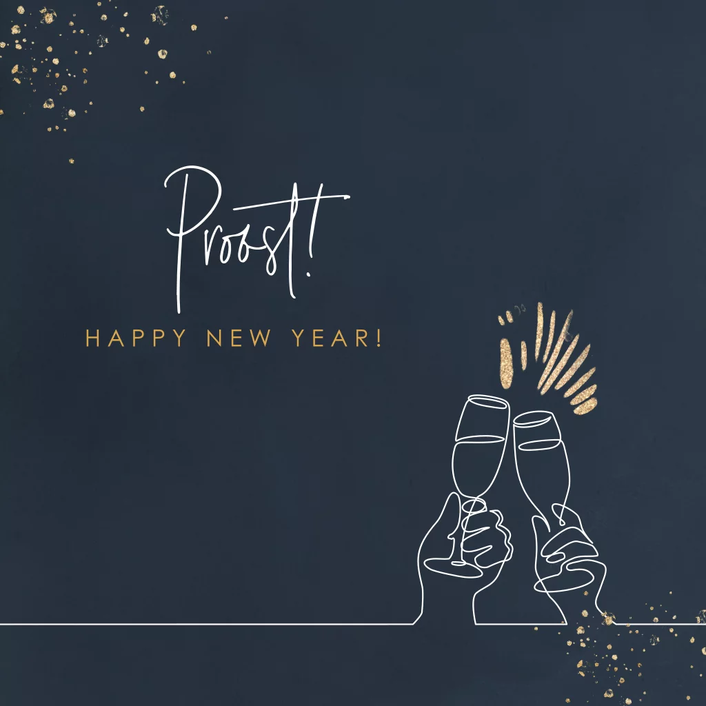 Feestelijke donkerblauwe kerstkaart met een lijntekening van klinkende champagne glazen. De goudkleurige spetters en verfstrepen zorgen voor een feestelijk effect. De combinatie van gouden details en de lijntekening maken dit tot een trendy kerstkaart. Stuur deze kaart naar uw werknemers en zakelijke relaties.