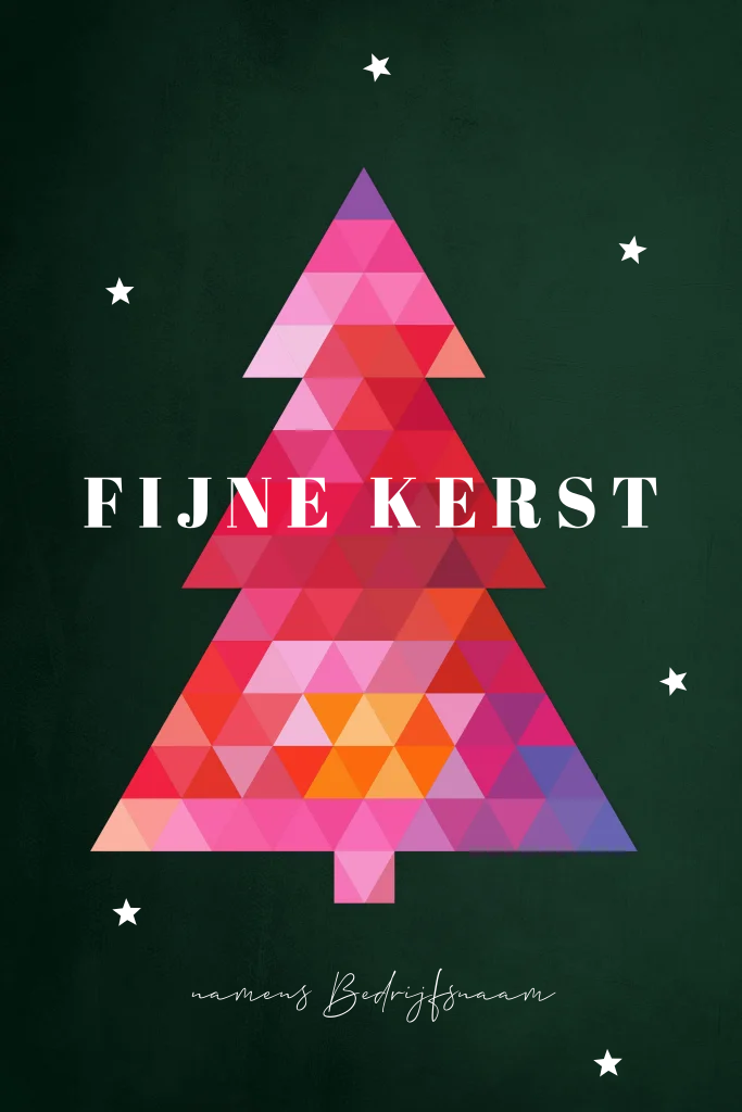 Zakelijke kerstkaart met een kerstboom in grafisch patroon in verschillende kleuren. Tekst staat in glimmend goudfolie en kun je zelf aanpassen.