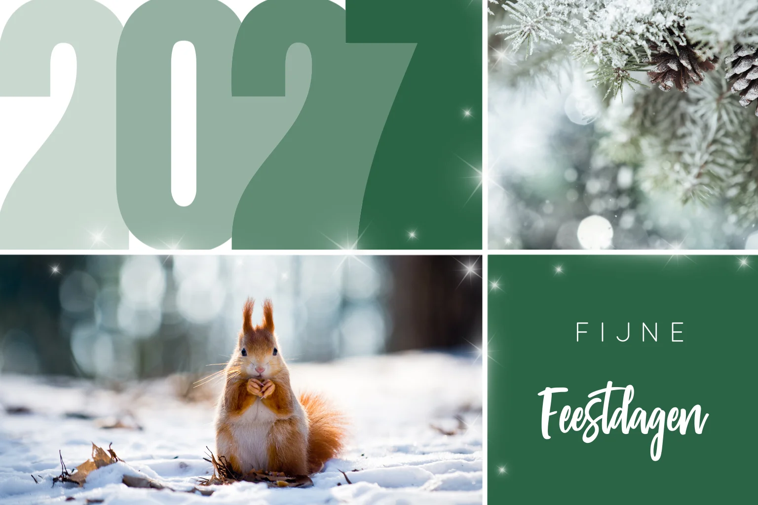 Prachtige groene kerstkaart met twee natuurfoto's (die je ook door eigen foto's kunt vervangen) en 2027 staat met grote, grafische weergave op de kaart. Je kan de kleuren naar wens aanpassen. Op deze manier kan je gemakkelijk zelf een unieke kerstkaart maken.