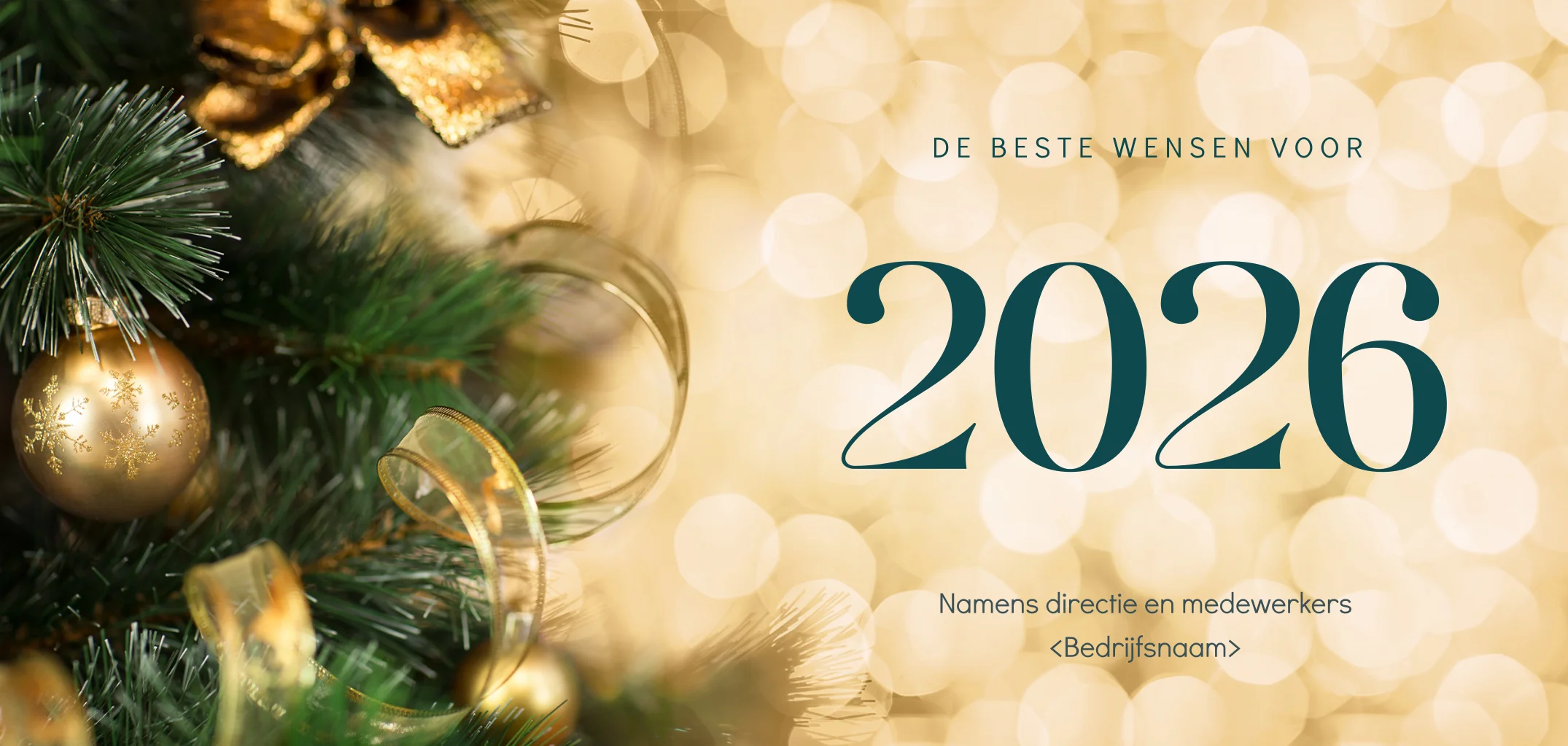 Sfeervolle kerstkaart met mooie close-up foto van een kerstboom met gouden kerstballen en linten. In een mooi lettertype staat het jaartal 2026 groot voorop. In de kaart is ruimte voor het logo en een persoonlijke tekst.