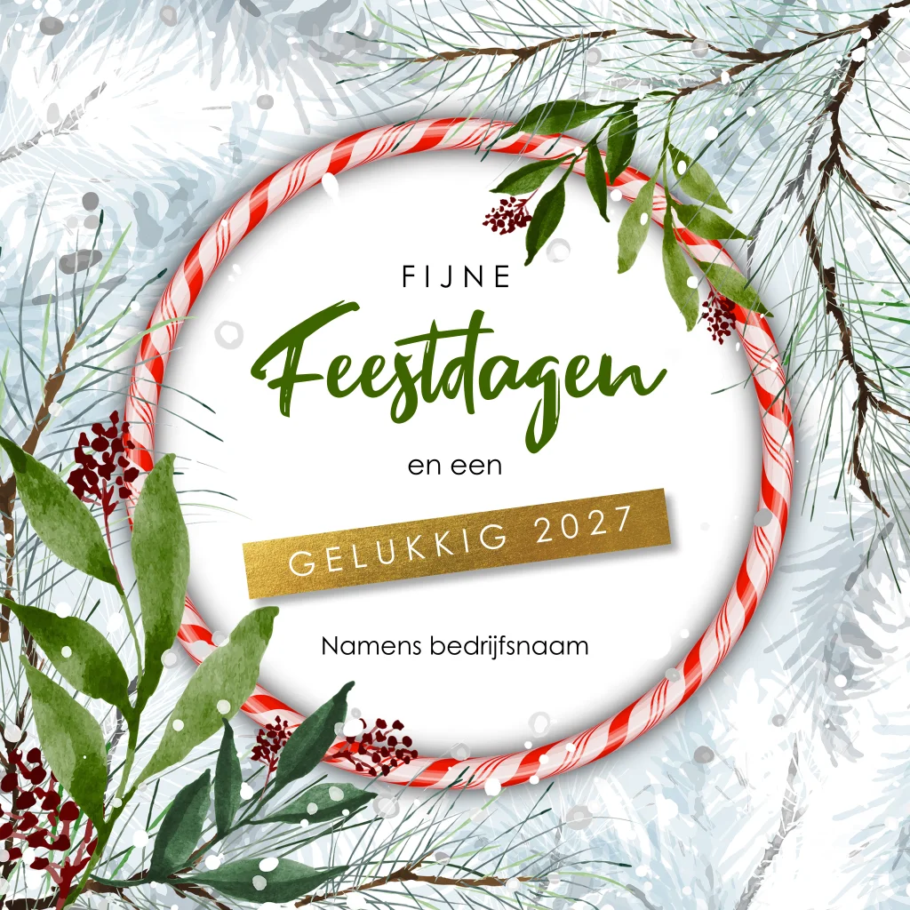 Op zoek naar een hippe kerstkaart om naar uw werknemers en zakenrelaties te sturen? Deze sfeervolle kerstkaart met snoepcirkel op wit/rood en vrolijke typografie is daar perfect voor. Pas de kaart gemakkelijk aan in onze handige designtool.