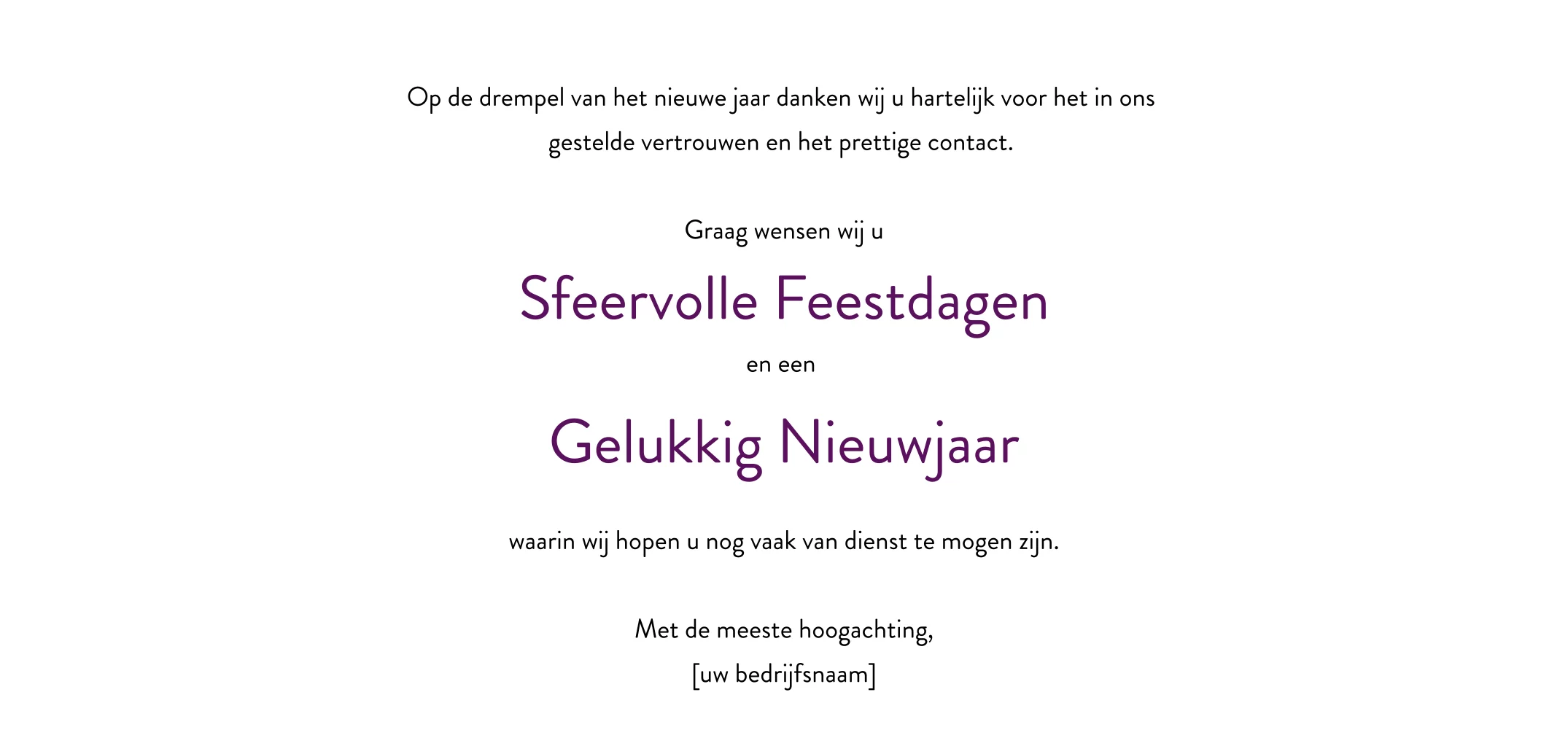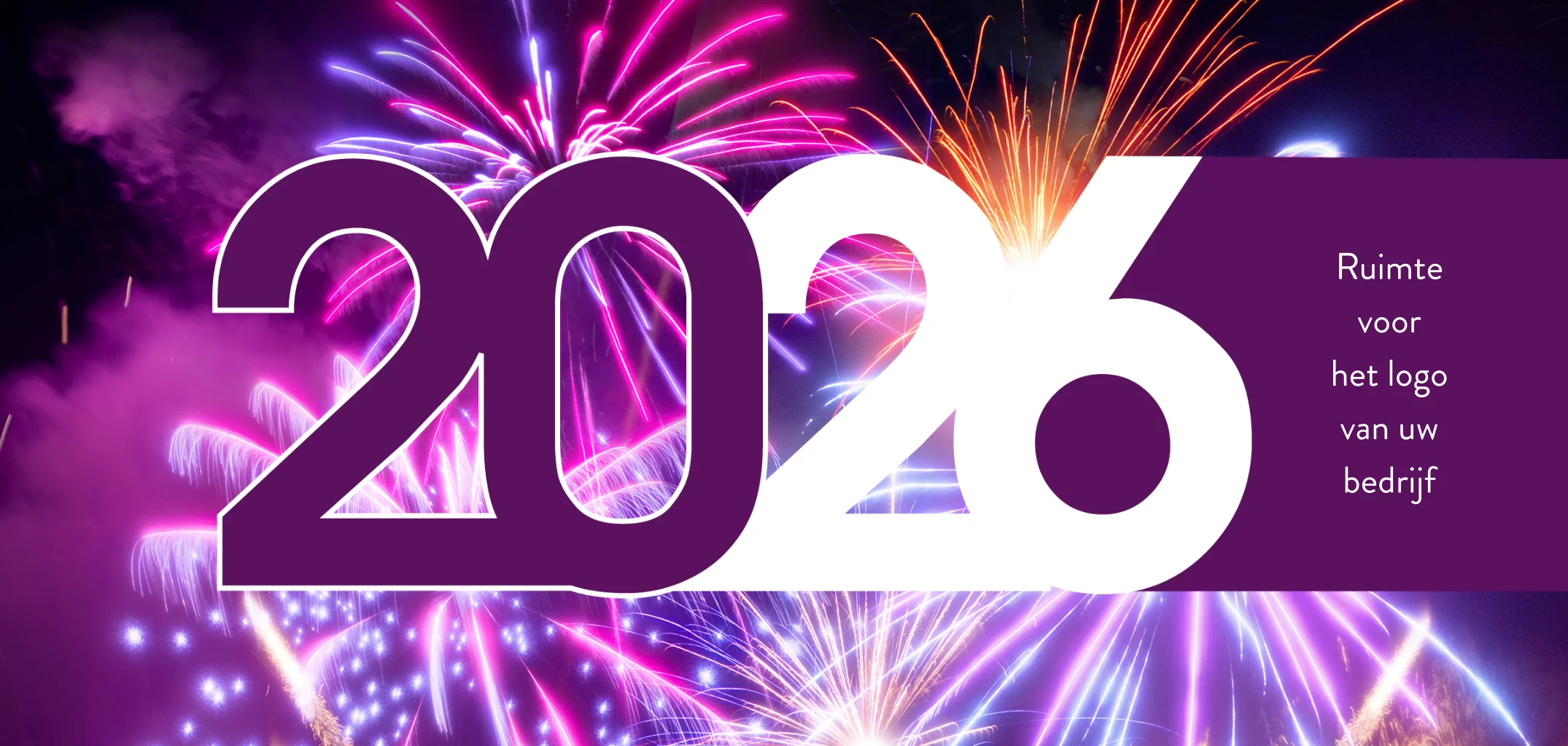 Feestelijke langwerpige kerstkaart om naar uw zakelijke relaties te sturen. Voorop een mooie foto van vuurwerk en daarop in paars het jaartal 2026. Wens uw zakelijke contacten prettig kerstdagen en een gelukkig nieuwjaar met deze feestelijke kerstkaart.