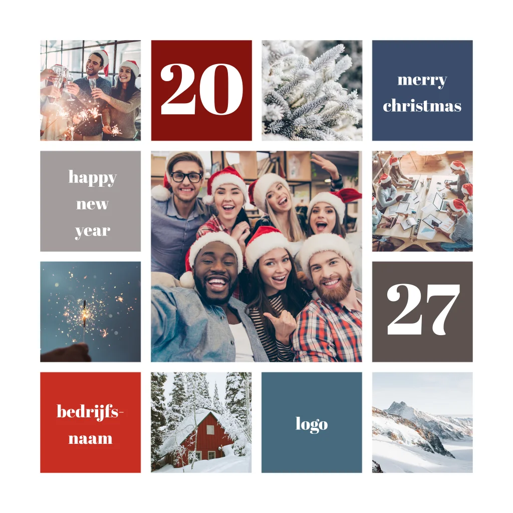Deze grafische kerstkaart is opgedeeld in dertien vlakken met foto's en gekleurde vlakken. Op de gekleurde vlakken in blauw, rood en grijs kunt u zelf een passende tekst toevoegen. Ook kunt u eenvoudig de foto's naar eigen inzicht aanpassen in onze handige ontwerptool. De foto's van vuurwerk, besneeuwde bergen en bomen kunt u eventueel laten staan voor een winterse en feestelijke sfeer. Aan de binnenkant van deze zakelijke kerstkaart kunt u uw contacten prettige feestdagen toewensen.