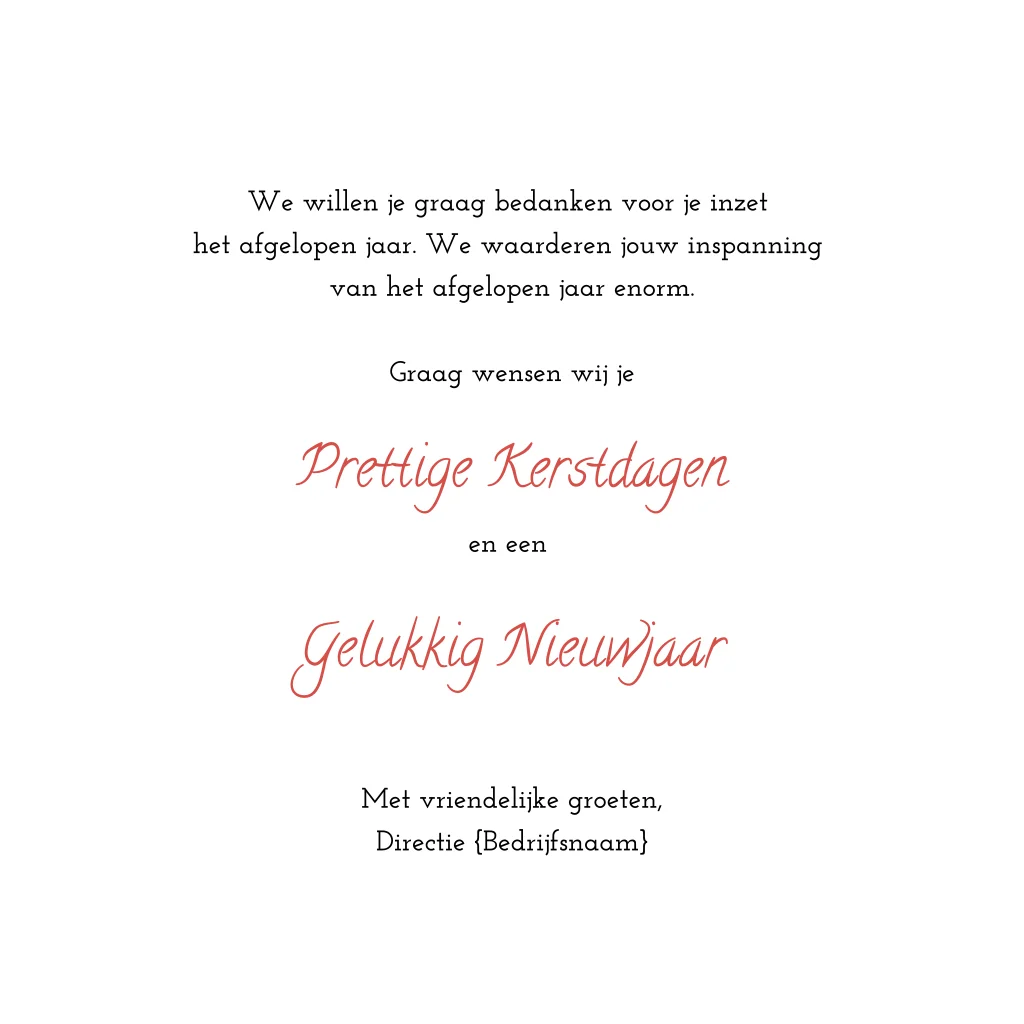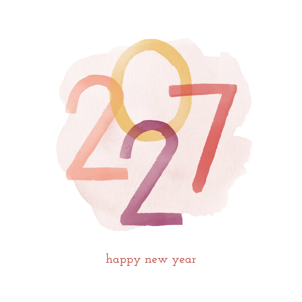 Een minimalistisch ontwerp met waterverf cijfers in verschillende, warme tinten. Wens uw collega's of werknemers een gelukkig nieuwjaar met dit stijlvolle kaartje. Aan de binnenkant kunt je nog eigen tekst kwijt en is er ruimte voor bijvoorbeeld uw bedrijfslogo. Pas dit ontwerp zelf aan in onze ontwerptool.