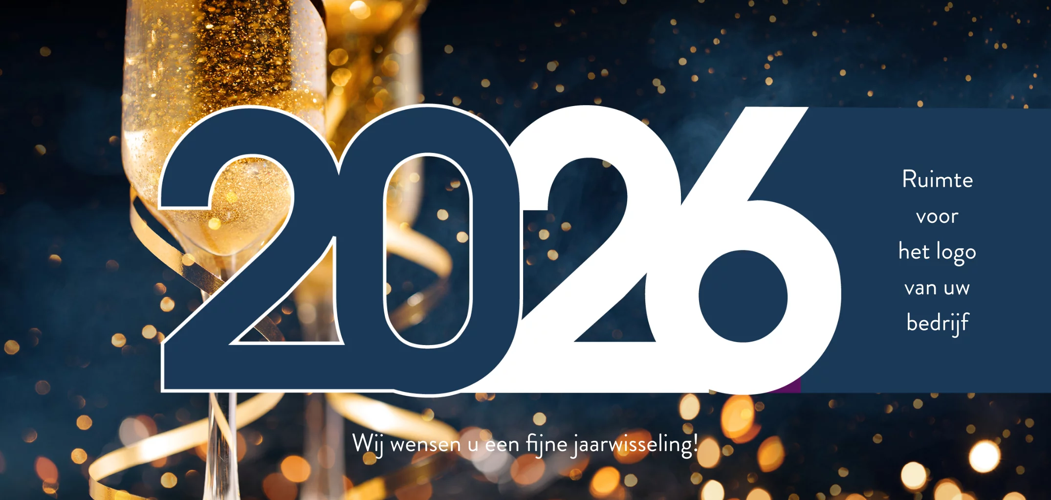 Mooie langwerpige nieuwjaarskaart met chique foto van champagneglazen en daarop in blauw het jaartal 2026. Wens uw zakelijke contacten een prettig nieuwjaar met deze stijlvolle en mooie kaart. Aan de binnenzijde is ruimte voor een tekst gericht aan de ontvangers.