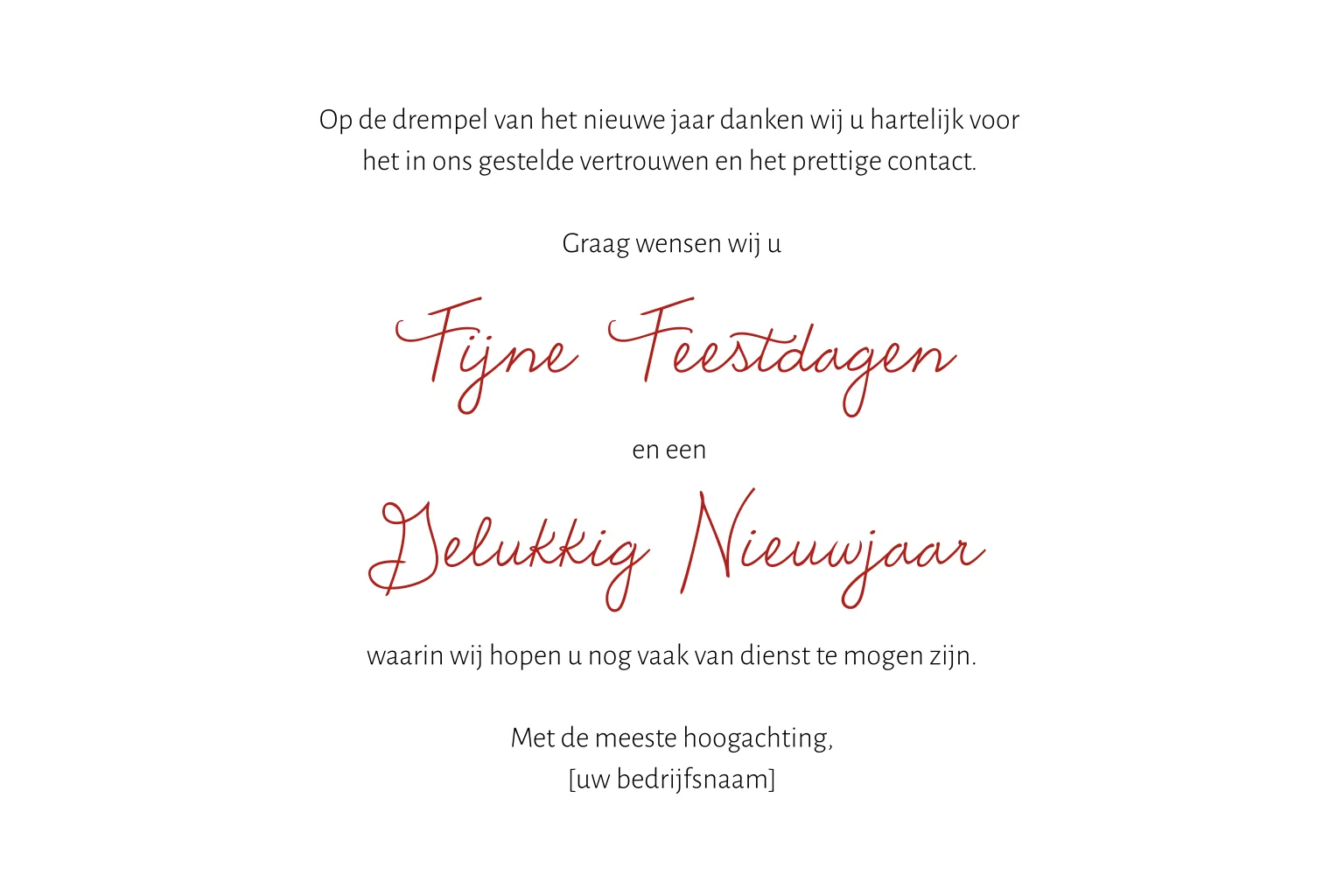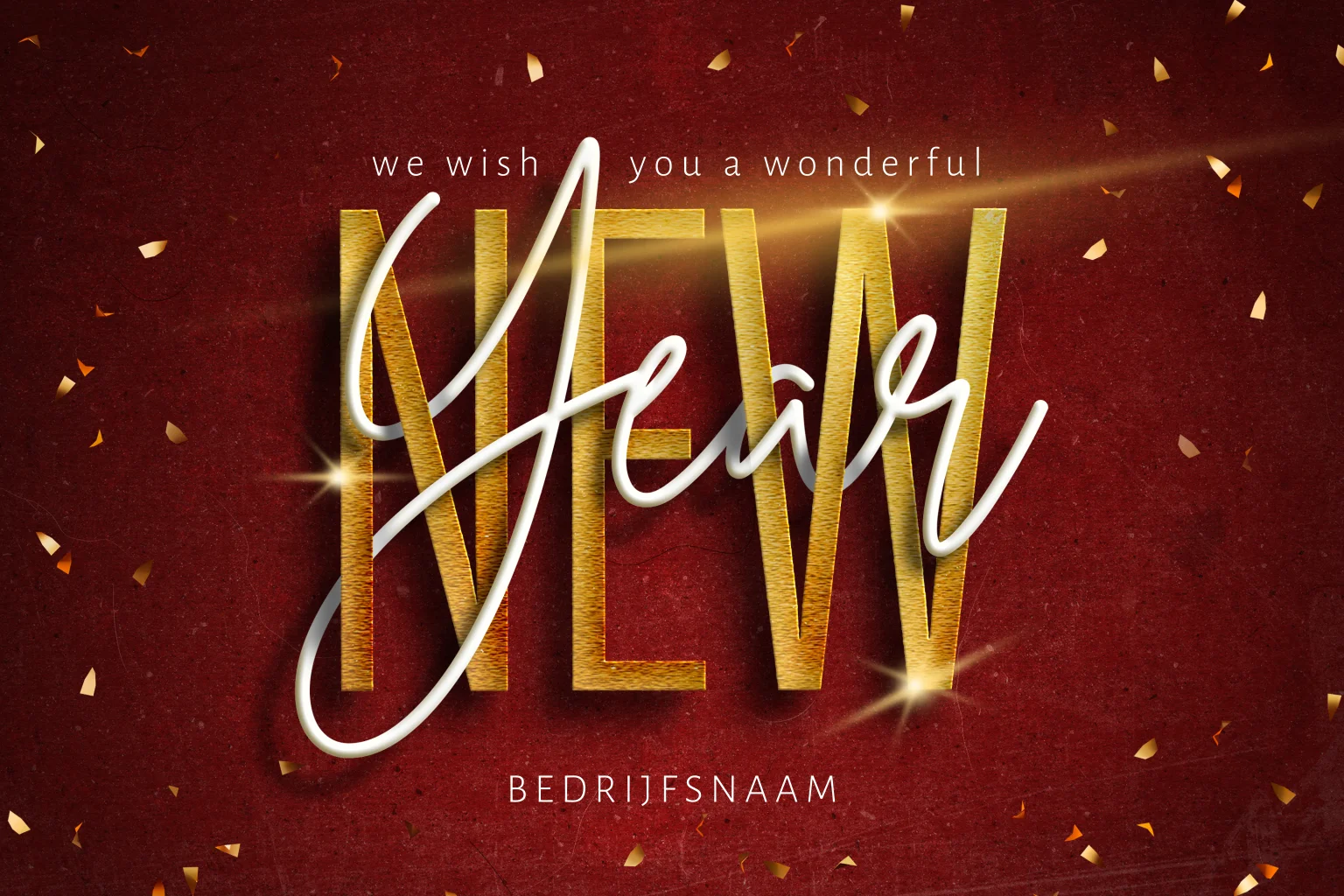 Feestelijke, rode kerstkaart met goudkleurige confetti en typografische nieuwjaarswens. Een opvallend ontwerp om al uw zakelijke contacten een gelukkig nieuwjaar mee toe te wensen. Aan ze binnenzijde is ruimte voor uw logo. Pas deze kaart naar eigen wens aan in onze editor.