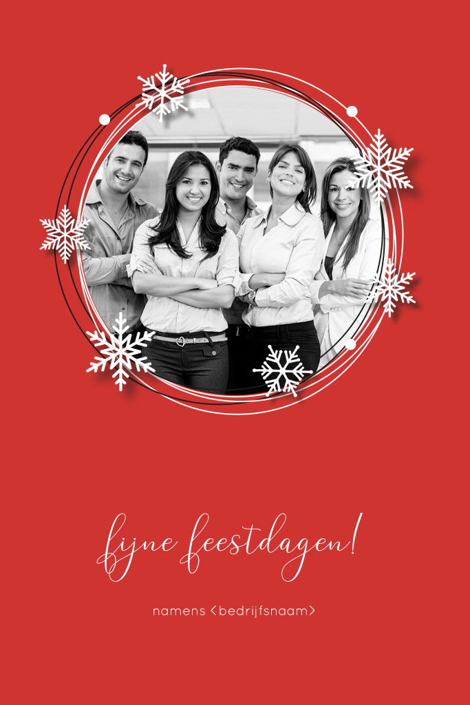 Deze zakelijke kerstkaart heeft een rode achtergrond met rond kader waar u een mooie foto kunt plaatsen. Rond de foto speelse cirkels met ijssterren. Vervang de foto door een eigen foto van bijvoorbeeld uw personeel.