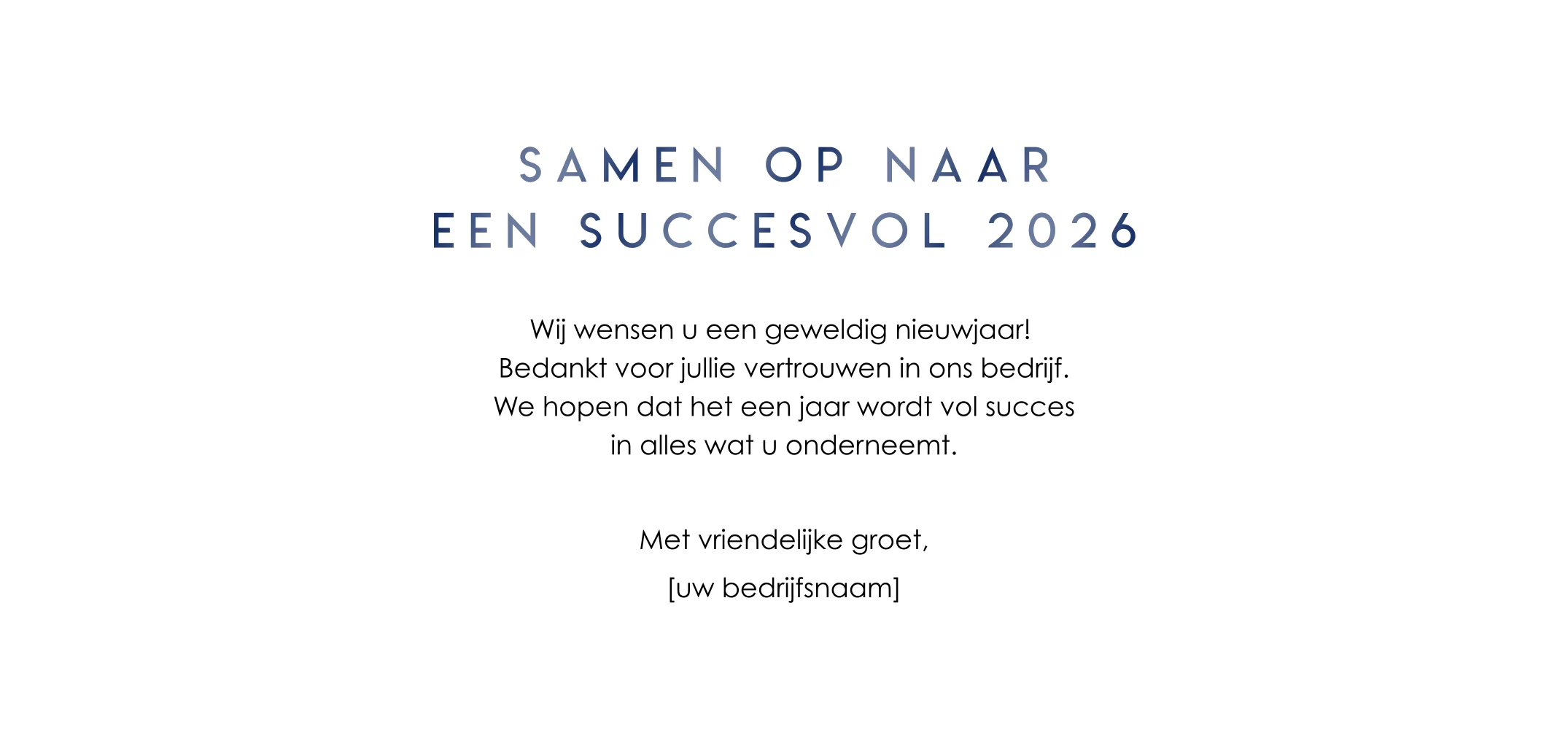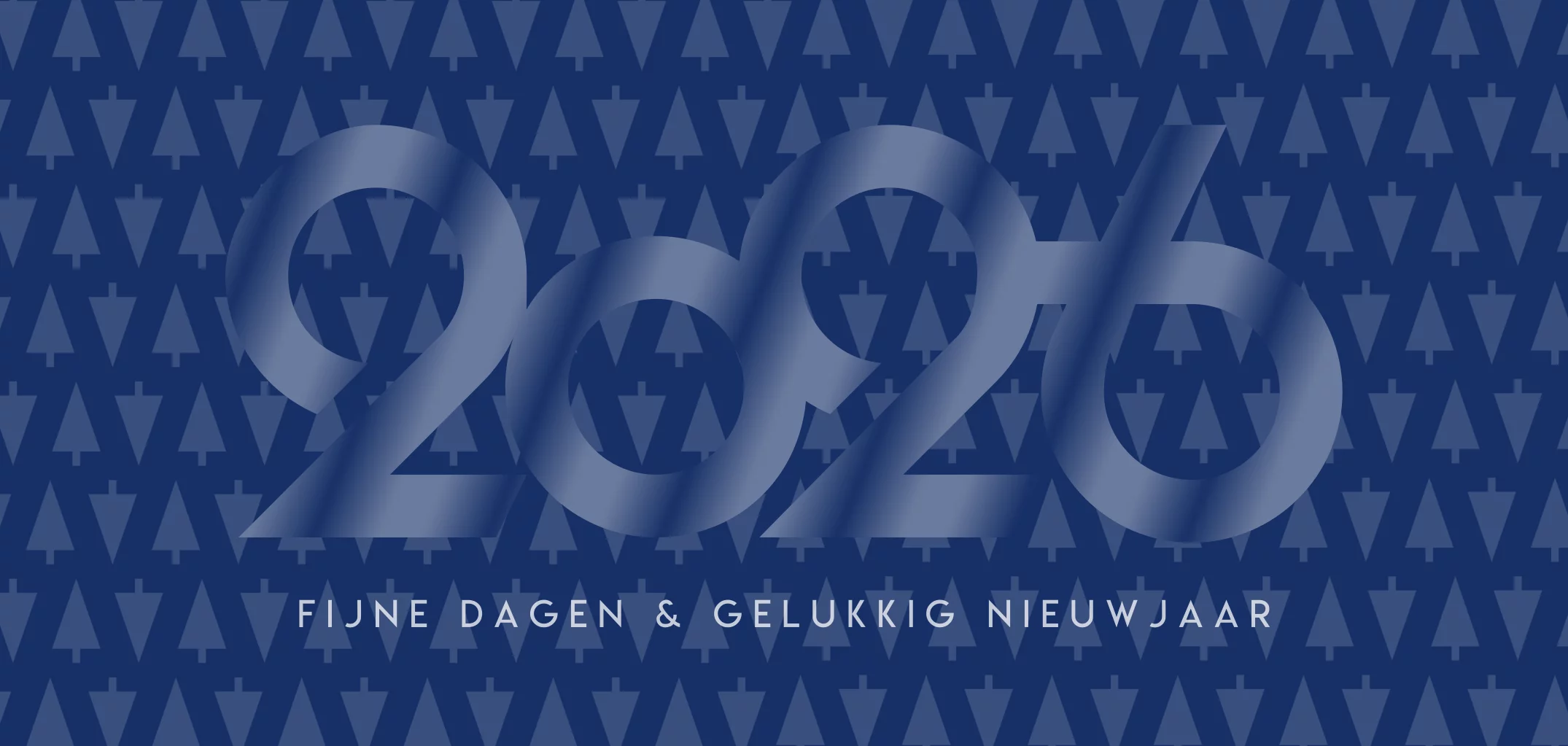 Unieke en moderne kerstkaart om te versturen naar zakelijke contacten, klanten of uw eigen werknemers. Op deze blauwe kaart staat op de achtergrond een subtiel, strak patroon van kleine kerstbomen. Daarbovenop komt het jaartal in glimmend hoogglans, in dezelfde tint blauw als de achtergrond. Dit geeft een heel bijzonder effect! Liever andere kleuren? Pas dit ontwerp zelf aan in onze editor, voeg uw eigen bedrijfslogo toe aan de binnenzijde en verras uw contacten met een originele kerstkaart.