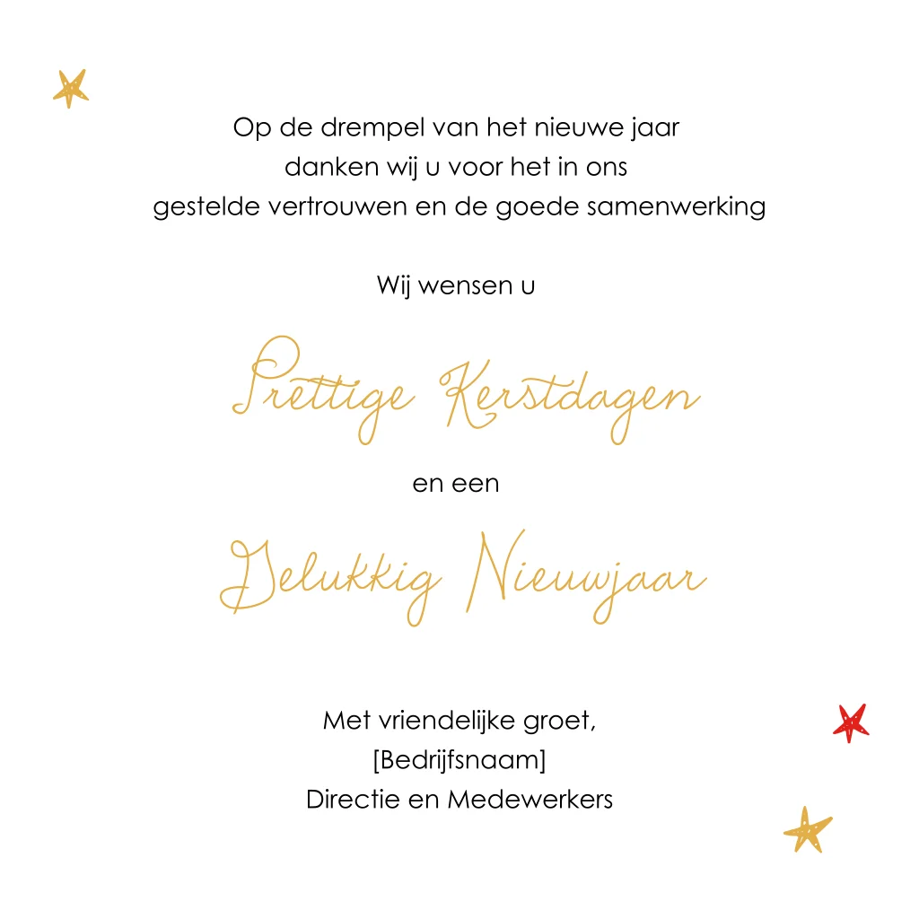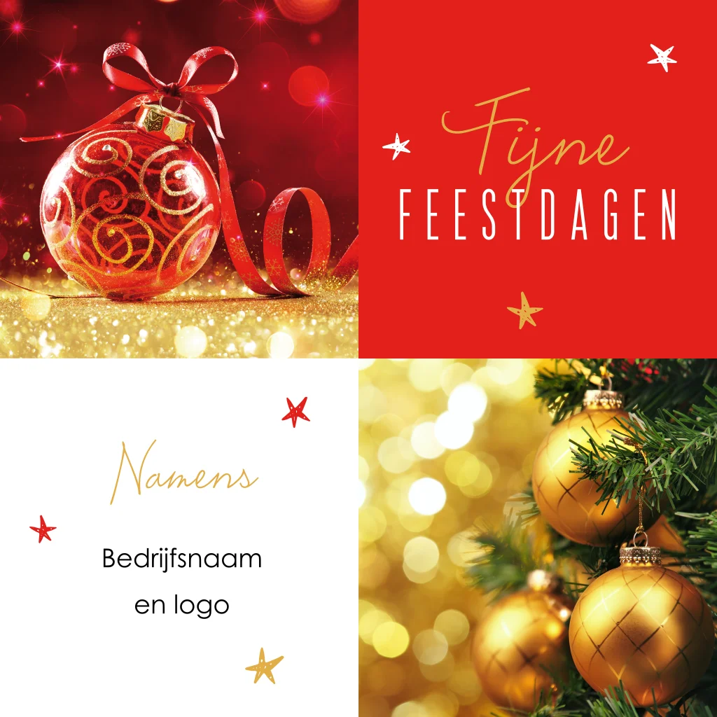 Mooie vierkante kerstkaart in vieren opgedeeld. Op twee vlakken staat een mooie kerstfoto die u ook door eigen foto's kunt vervangen. In het bovenste vlak rechts staat de kerstwens en linksonder is er ruimte voor uw bedrijfsnaam en -logo.