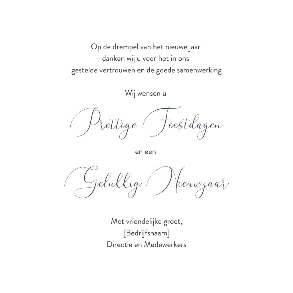 Een zakelijke kerstkaart met op de voorzijde ruimte voor twee eigen foto's, daarnaast staan twee vlakken met donkerblauwe tekst. Een kerstkaart met eigen foto's zorgt voor een persoonlijke manier om uw zakelijke contacten een fijne kerst toe te wensen.