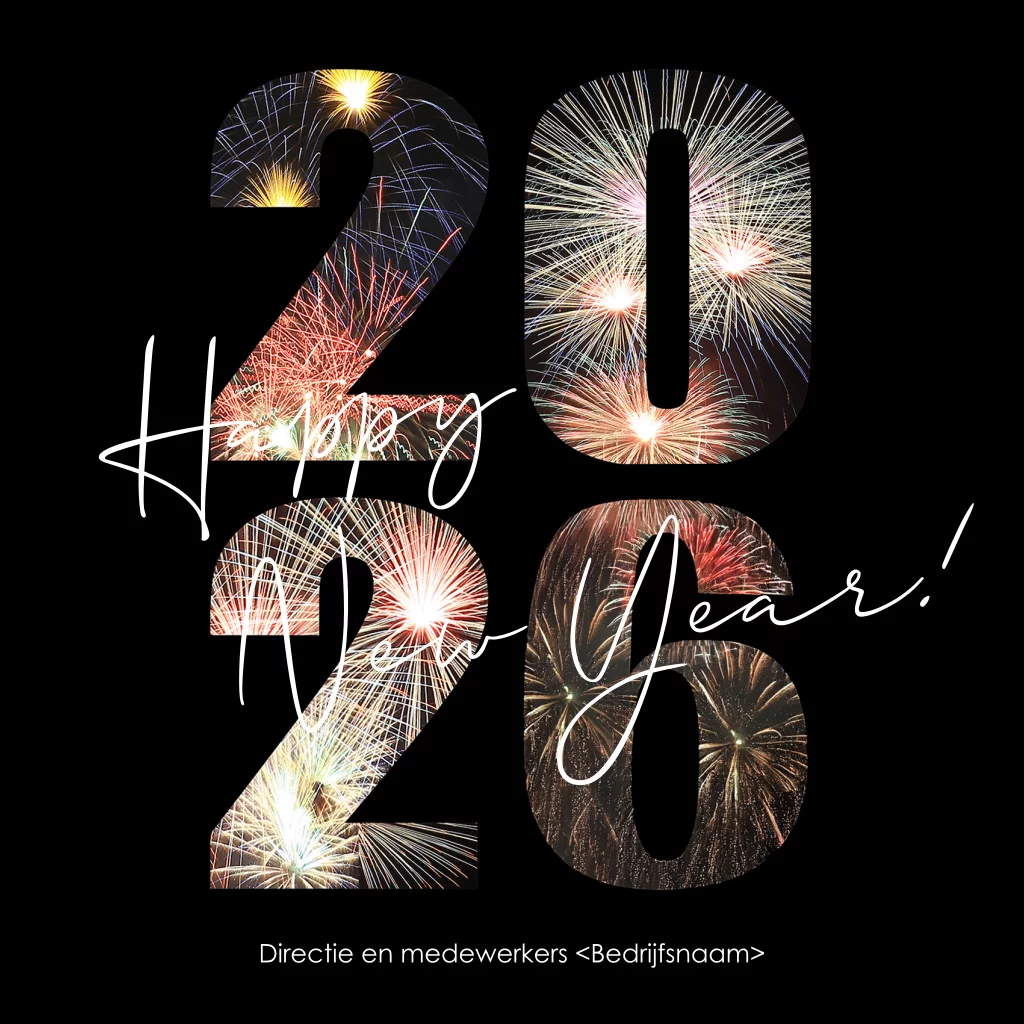 Zwarte nieuwjaarskaart met vuurwerk en groot 2026