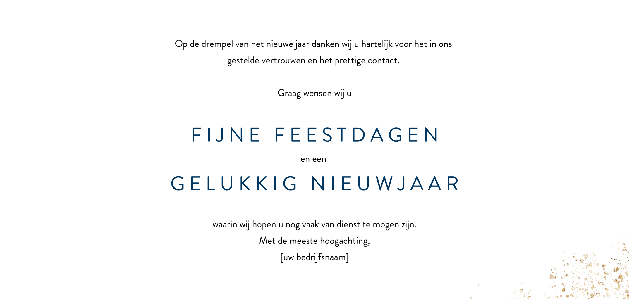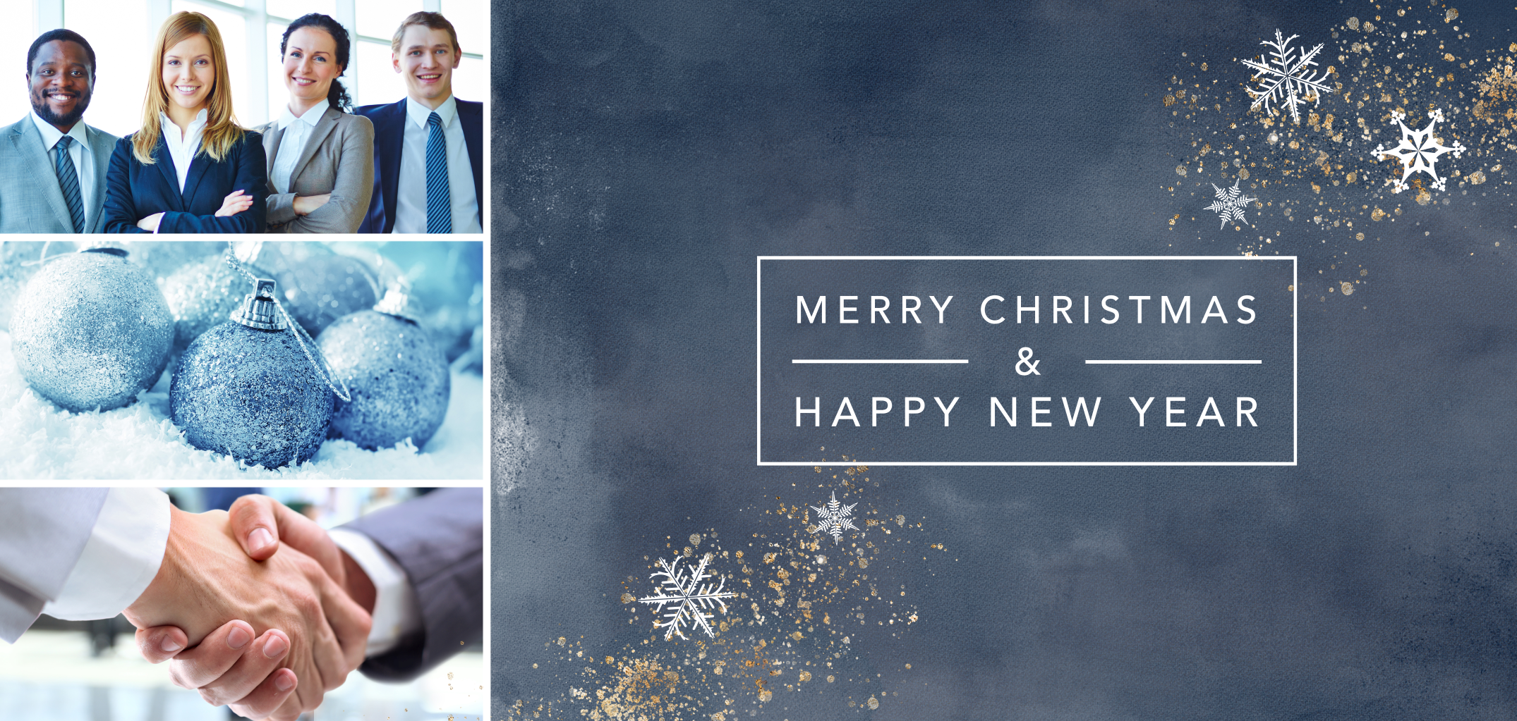 Zakelijke kerstkaart met donkerblauwe waterverf en aan de linkerzijde ruimte voor drie mooie zakelijke foto's. De gouden spetters en witte ijssterren maken de kaart tot een mooi geheel. Heb je zelf foto's die je wilt toevoegen? Geen probleem, met de editor kun je de foto's eenvoudig aanpassen.