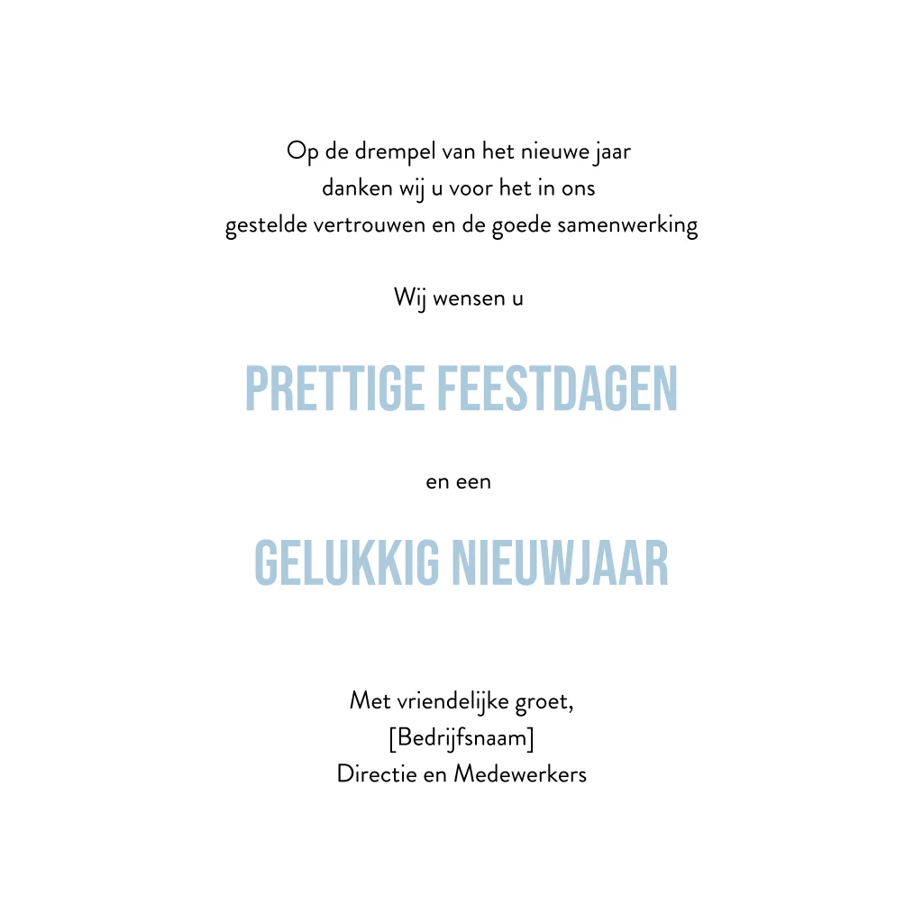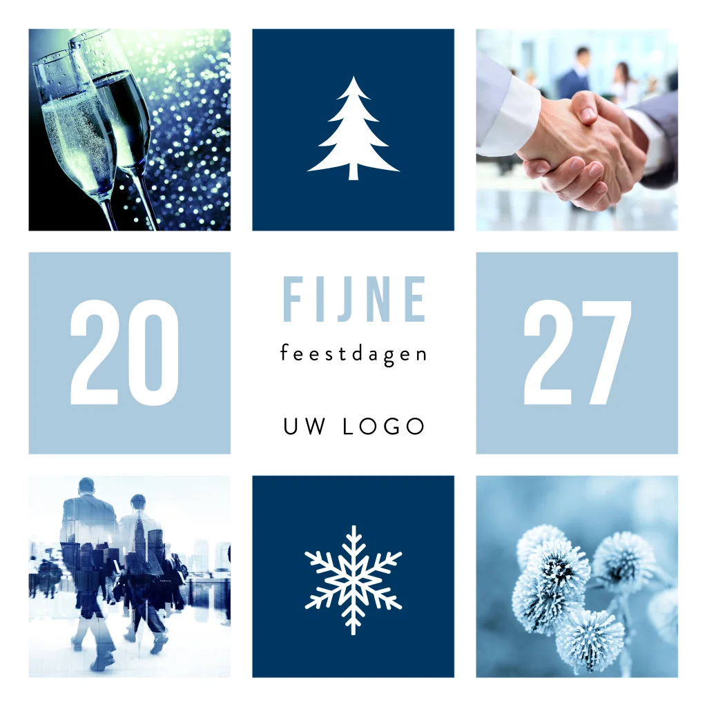 Strakke kerstkaart voor de financiële branche. De kaart is verdeeld in negen vlakken. In ieder vlak is er ruimte voor het jaartal, een mooie foto en/of een logo. Door de foto's aan te passen creëer je zelf een unieke en persoonlijke kerstkaart. Geef fan van blauw? Ook de kleuren zijn gemakkelijk te wijzigen in onze online tool.