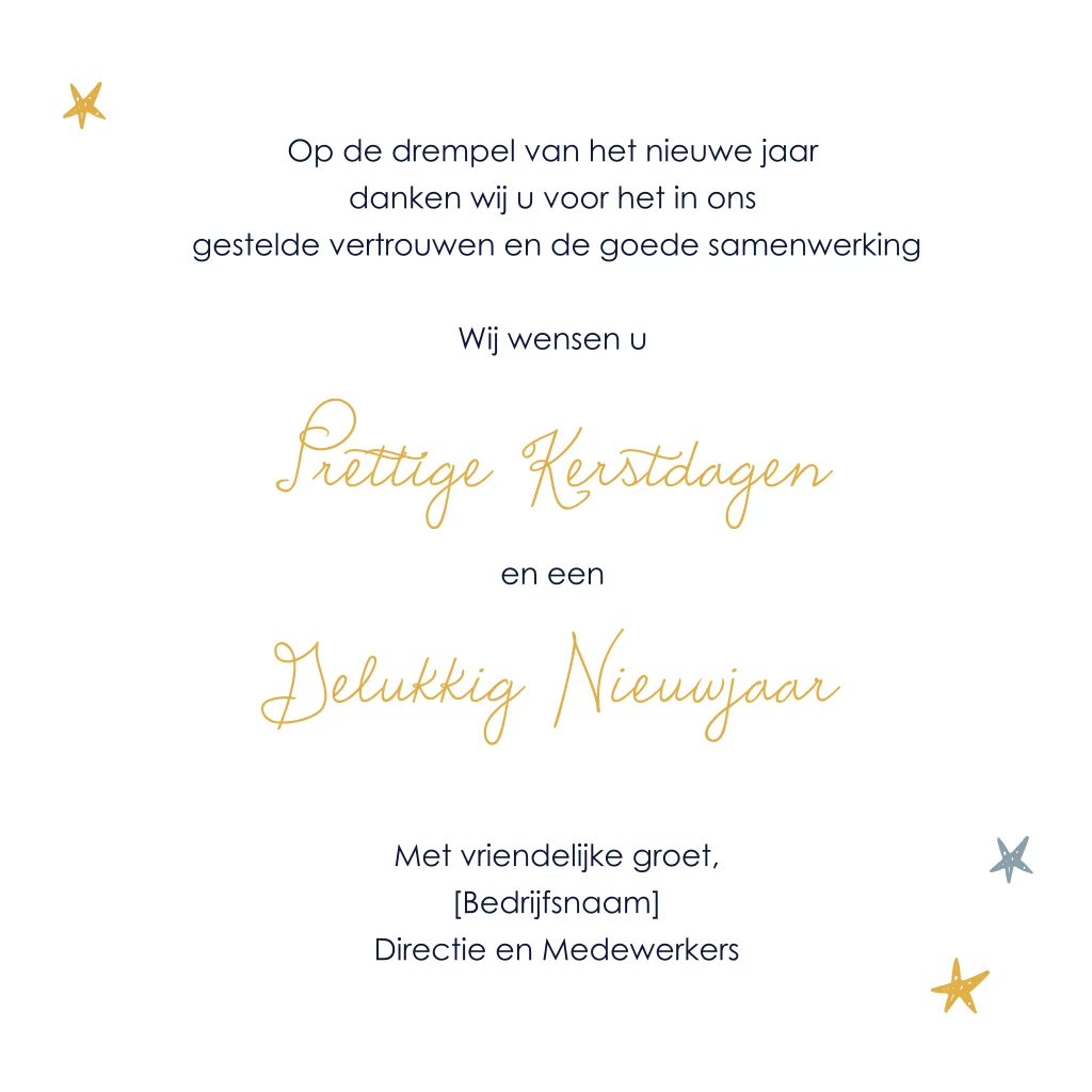 Mooie, zakelijke kerstkaart met een moderne uitstraling. In het bovenste blauwe vlak rechts staat de kerstwens en linksonder is er ruimte voor uw bedrijfsnaam en -logo. De kaart is versierd met kleine sterretjes. Dit ontwerp is geheel naar wens aan te passen. U kunt een proefdruk bestellen, zodat u de kaart in het echt kunt beoordelen.