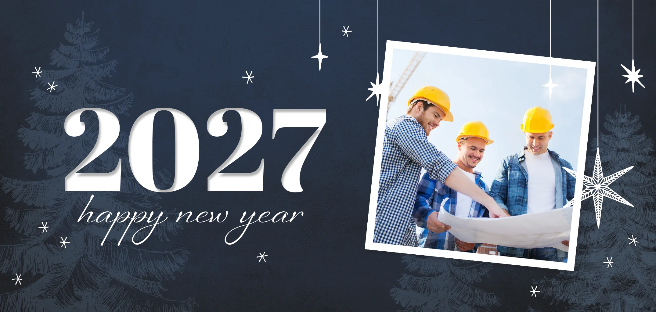 Donkerblauwe kerstkaart foto bouwvakkers en goudfolie sterren