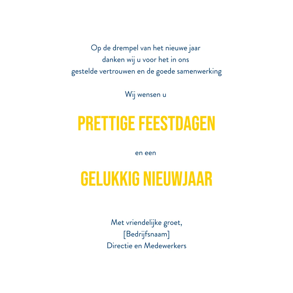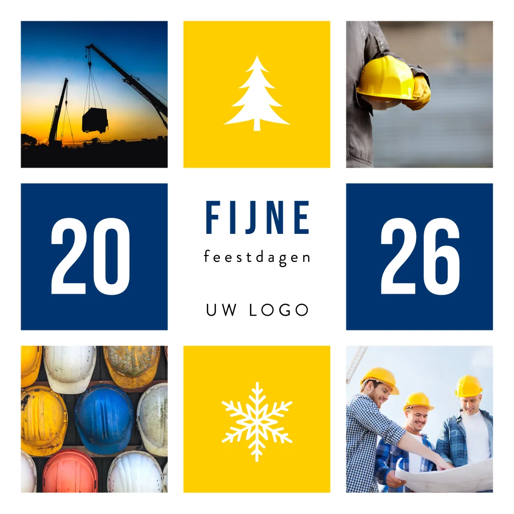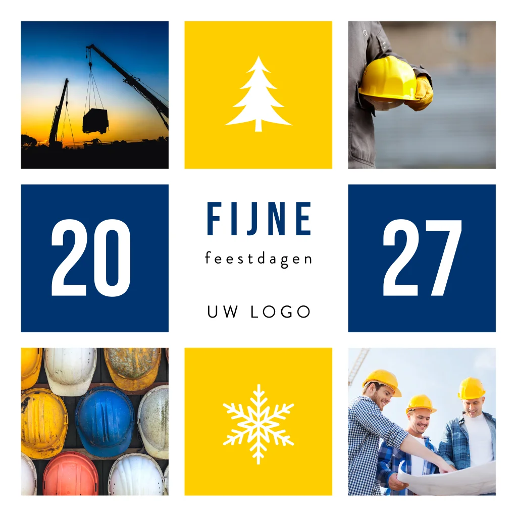 Moderne kerstkaart voor de bouw verdeeld in 9 vlakken. In vier kaders is ruimte voor een foto. In het midden plaats je de bedrijfsnaam of het logo. In de overige twee vlakken staat het jaartal.