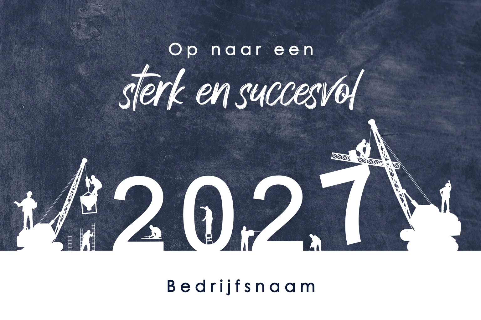Leuke, zakelijke nieuwjaarskaart met 2027, bouwplaats en de 7 in goudfolie. In speelse, gouden letters wenst u uw zakelijke relaties een 'sterk en succesvol' nieuwjaar toe. Het jaartal staat middenin een illustratie van een drukke bouwplaats. Een speels ontwerp om al uw medewerkers, klanten of andere zakelijke contacten een goed nieuwjaar mee toe te wensen. Liever een andere kleur folie? Pas deze kaart zelf aan in onze editor en bestel een proefdruk.