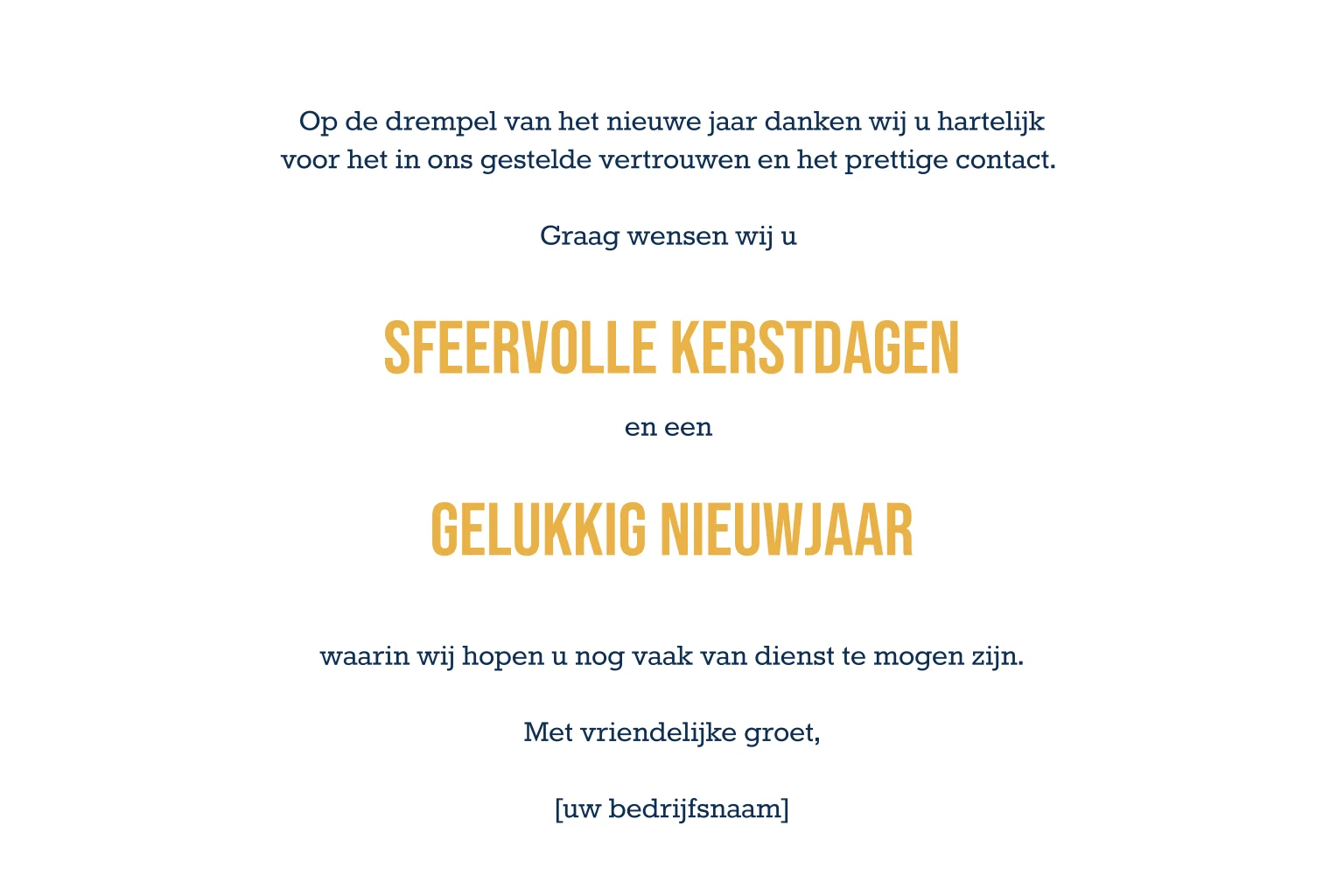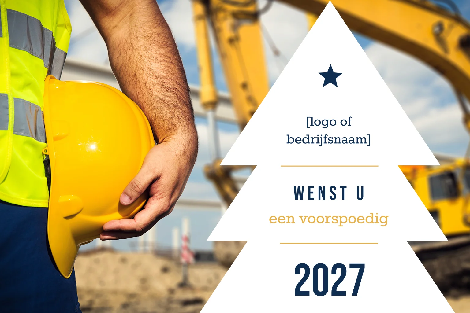 Liggende, dubbele kerstkaart met een grafische witte kerstboom, waarin een nieuwjaarswens met gele en blauwe typografie staat. Op de achtergrond zie je een foto van een bouwvakker op de bouwplaats met veiligheidsjas aan en een helm in z'n hand. Uiteraard kunt u hier ook uw eigen foto plaatsen.