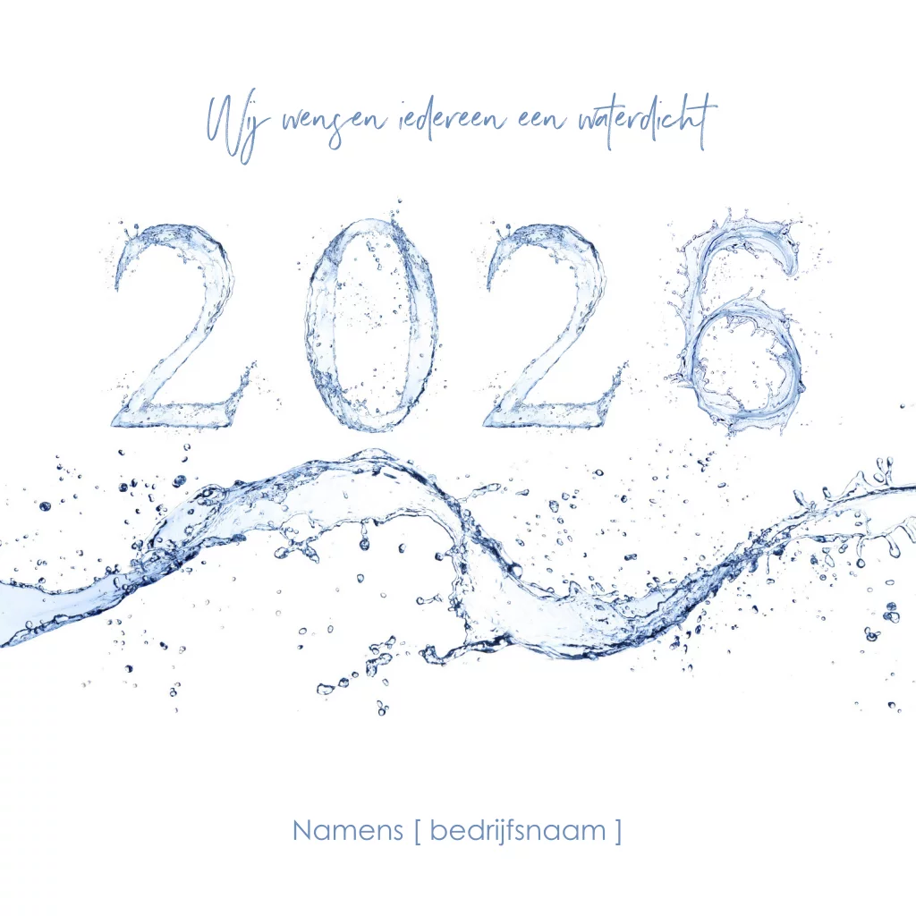 Leuke kerstkaart voor loodgieters met de toepasselijke tekst: 'Wij wensen iedereen een waterdicht 2026!' Zakelijke kaart met de cijfers 2026 als water en een watergolf eronder.