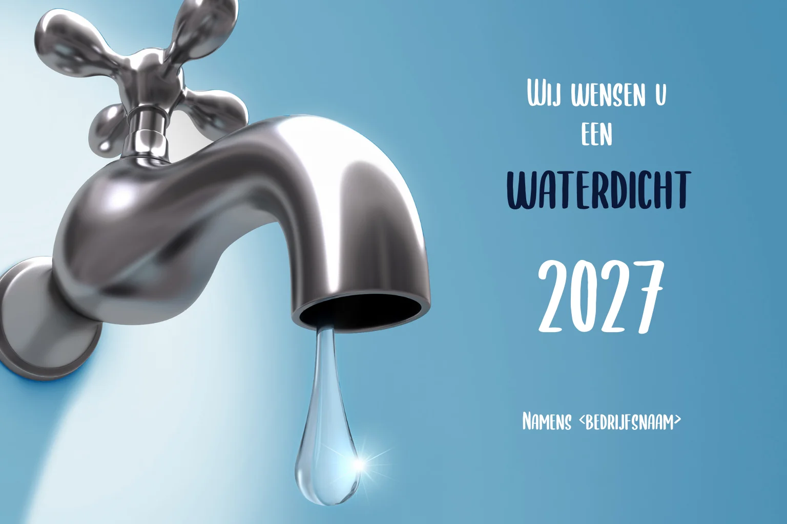 Ideale kerstkaart voor loodgieters. Kerstkaart met voorop een waterkraan en daarbij de toepasselijke tekst 'Wij wensen u een waterdicht 2027'. Bent u loodgieter? Kies dan voor deze kerstkaart.