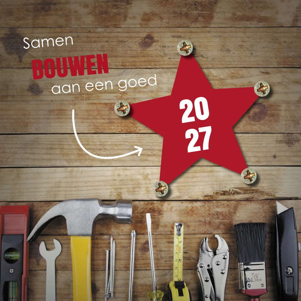 Stoere kerstkaart met hout, gereedschap en vastgeschroefde rode ster. Toepasselijke tekst: 'Samen bouwen aan een goed 2027'. Leuk om naar uw relaties in de bouw te sturen.