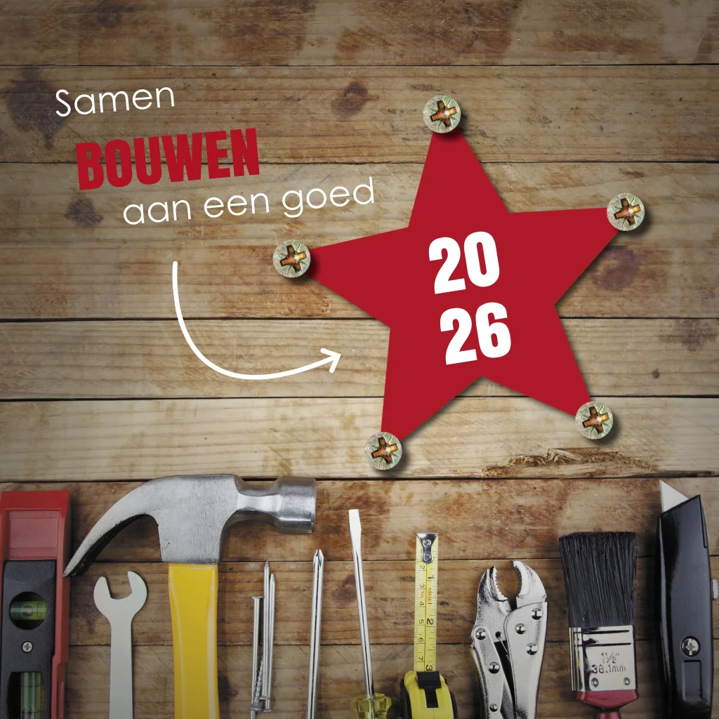 Stoere kerstkaart met hout, gereedschap en vastgeschroefde rode ster. Toepasselijke tekst: 'Samen bouwen aan een goed 2026'. Leuk om naar uw relaties in de bouw te sturen.