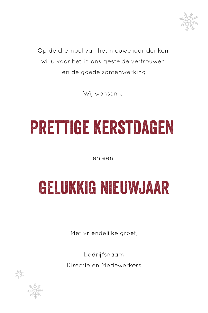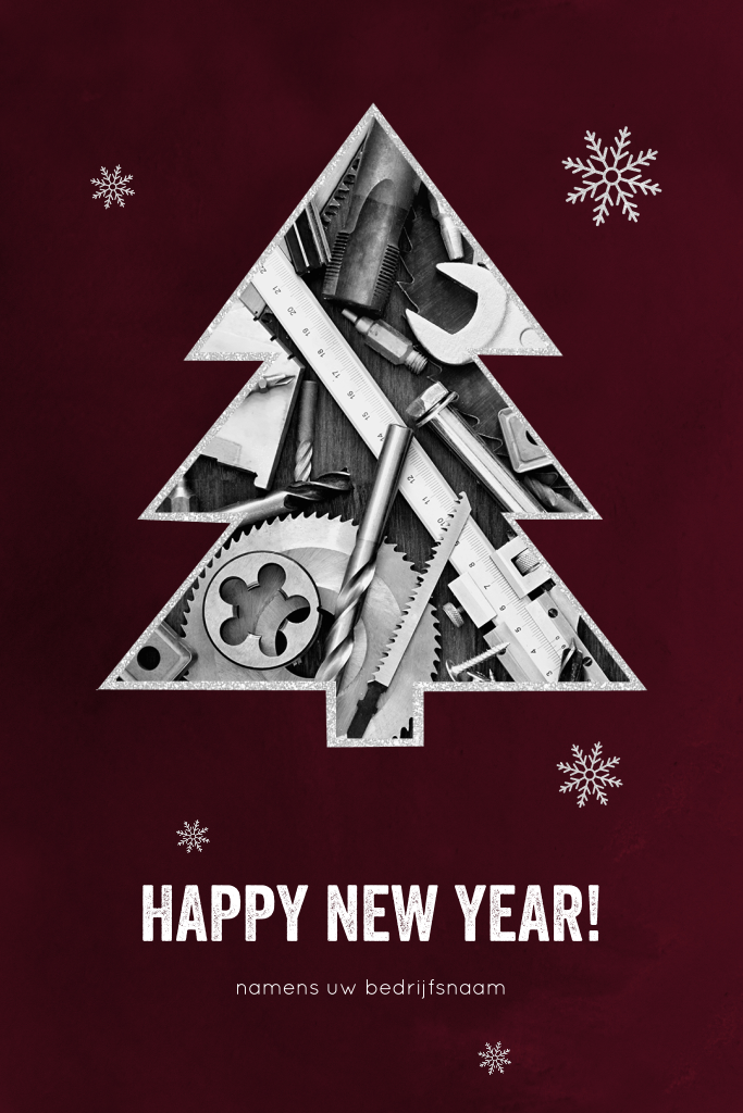 Ben je op zoek naar een stoere kerstkaart? Dit ontwerp heeft een donkerrode achtergrond en een fotokader in de vorm van een zilveren kerstboom. De rest van de kaart is versierd met bijpassende sneeuwsterren. In het kader kunt u een eigen foto plaatsen. Pas de kaart naar wens aan en voor u het weet heeft u een mooie persoonlijke kerstkaart om te versturen naar uw relaties, klanten en medewerkers.