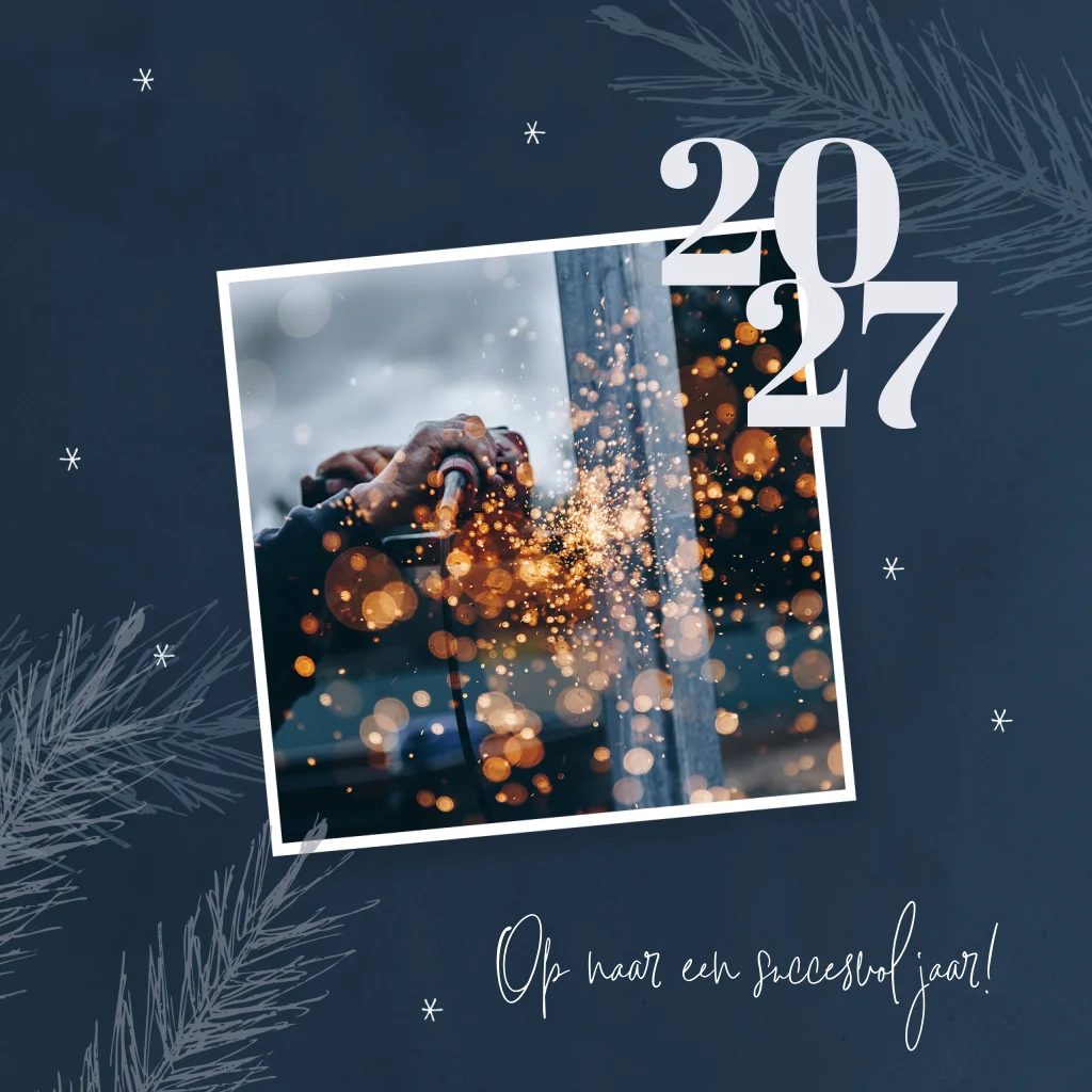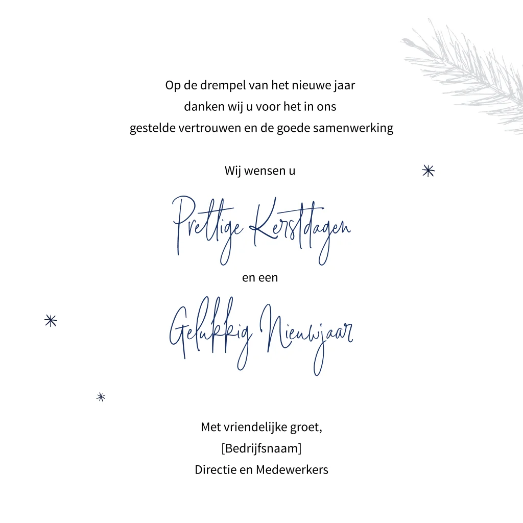 Aan het einde van het jaar wilt u uw zakelijke contacten bedanken voor de samenwerking en hen een succesvol nieuwjaar toe wensen. Met deze kerstkaart kunt u dat op een stijlvolle manier doen. Plaats eventueel een eigen foto in het fotokader en pas de teksten aan. Zo krijgt u op een eenvoudige manier een gepersonaliseerde kerstkaart dat perfect aansluit bij uw bedrijf.