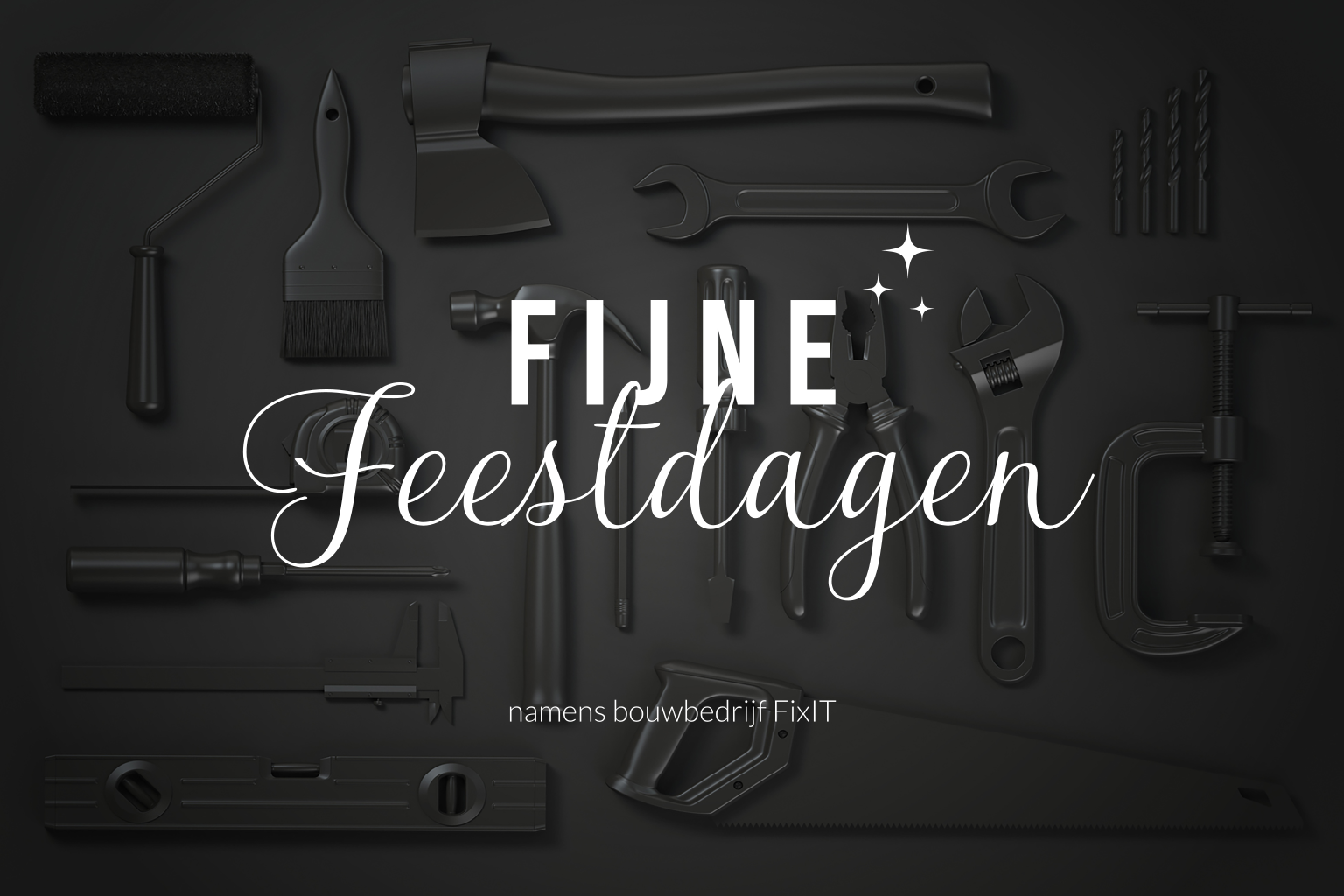 Zakelijke kerstkaart voor de bouwbranche met mooie zwarte achtergrond. Hierin zijn diverse soorten gereedschappen te zien. In chique typografie staat de tekst: fijne feestdagen in goudfolie. Aan de binnenzijde is ruimte voor een persoonlijke tekst en uw logo.