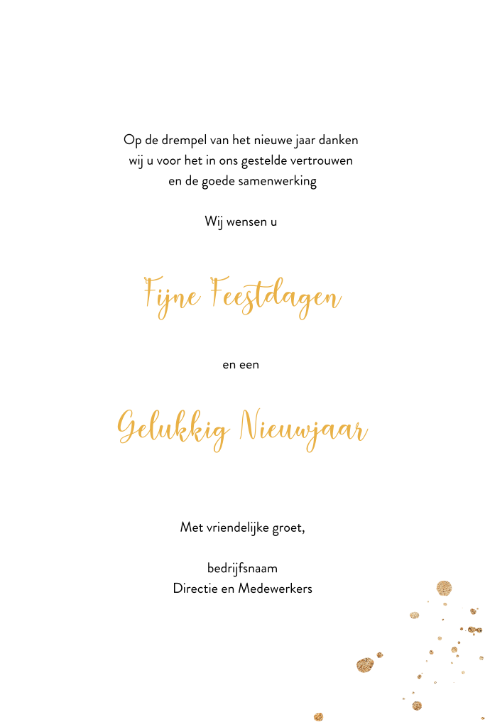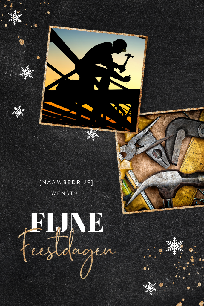 Op zoek naar een stoere en toch stijlvolle kerstkaart om als bouwbedrijf naar medewerkers en zakenrelaties te sturen? Kies dan voor dit hippe ontwerp met betonlook. De twee goudkleurige fotokaders matchen mooi met de witte sterren en spetters. Plaats eigen foto's of maak gebruik van onze beelden. Bestel een drukproef op een papiersoort naar keuze.