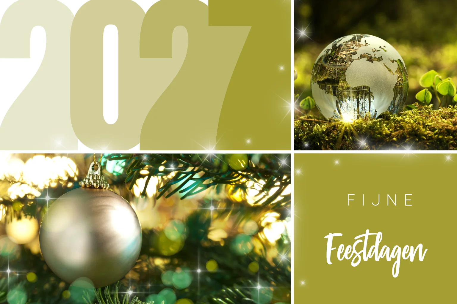 Prachtige groene kerstkaart met twee foto's (die je ook door eigen foto's kunt vervangen) en 2027 staat met grote, grafische weergave op de kaart. Je kan de kleuren naar wens aanpassen. Op deze manier kan je gemakkelijk zelf een unieke kerstkaart maken.