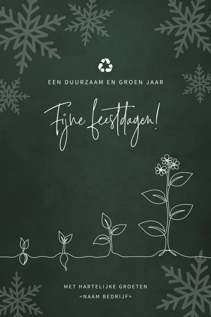 Met deze duurzame zakelijke kerstkaart wens je relaties, klanten en collega’s op een groene manier fijne feestdagen. De kaart toont een lijnillustratie van een groeiende plant, symbool voor ontwikkeling, bloei en duurzaamheid. De donkergroene achtergrond met sneeuwvlokken en gouden typografie geeft een feestelijke en stijlvolle uitstraling.
