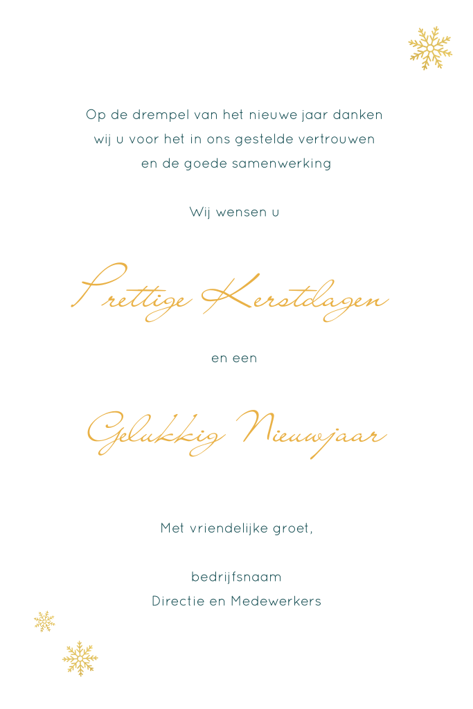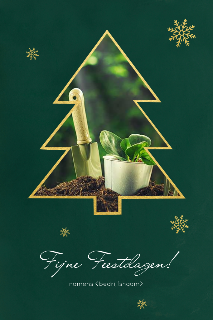 Verstuur deze feestelijke kerstkaart naar al je zakenrelaties, klanten en medewerkers. De kaart heeft een diepgroene achtergrond. Op de voorgrond staat een fotokader in de vorm van een kerstboom. Vervang de foto om de kaart een persoonlijke touch te geven. De gouden sneeuwsterren komen terug aan de binnenzijde van de kaart.