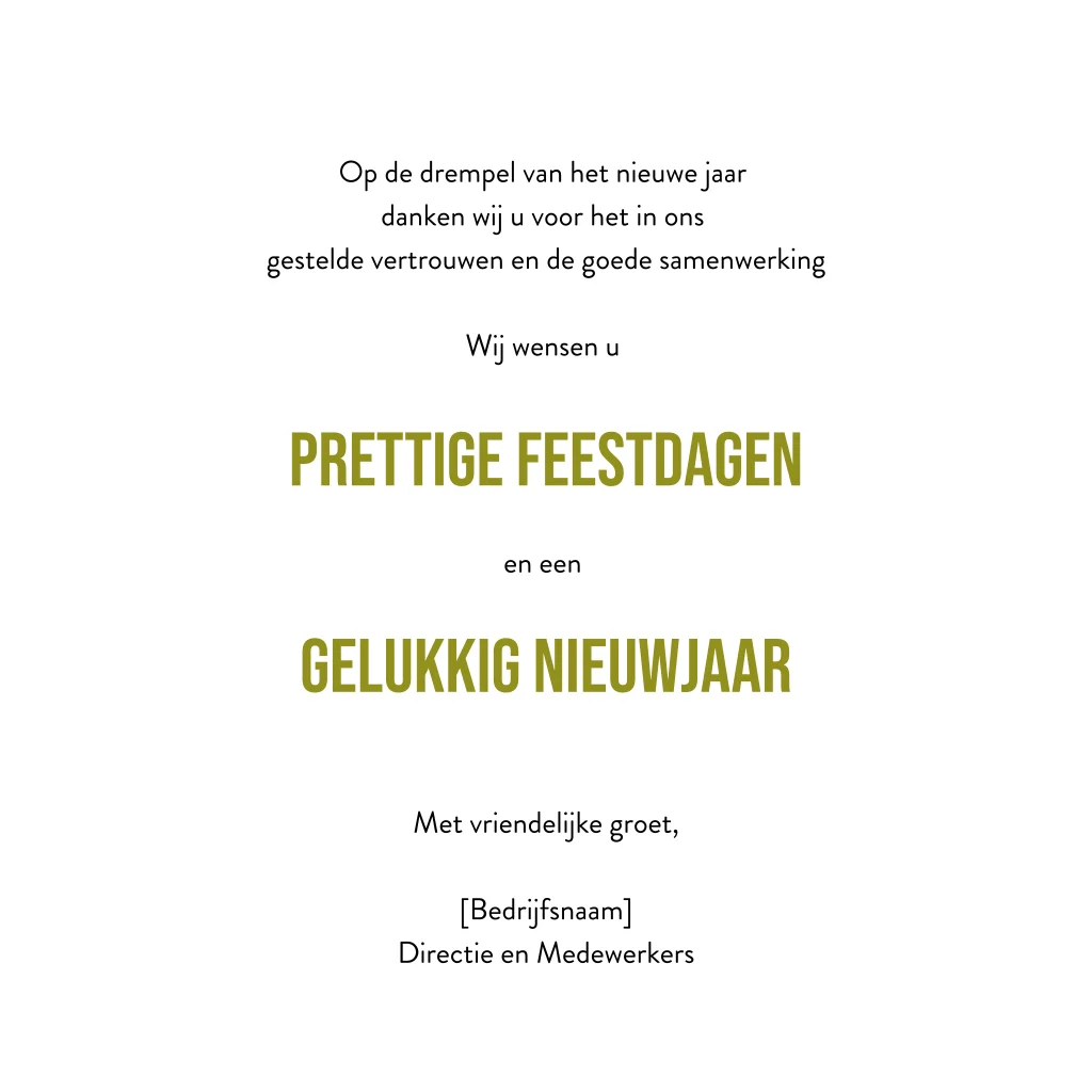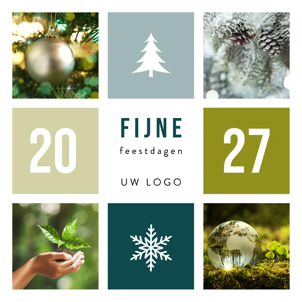 Mooie kerstkaart voor een groene wereld. De kaart is verdeeld in 9 vierkanten. In vier vlakken ziet u natuur en eco foto's. In de overige vlakken staat een jaartal en een kerstwens. Heeft u zelf bijpassende foto's? Dat kan natuurlijk ook. Plaats uw eigen foto's in de kaders. Daarnaast kan u ook zelf de kleuren en lettertypes aanpassen.