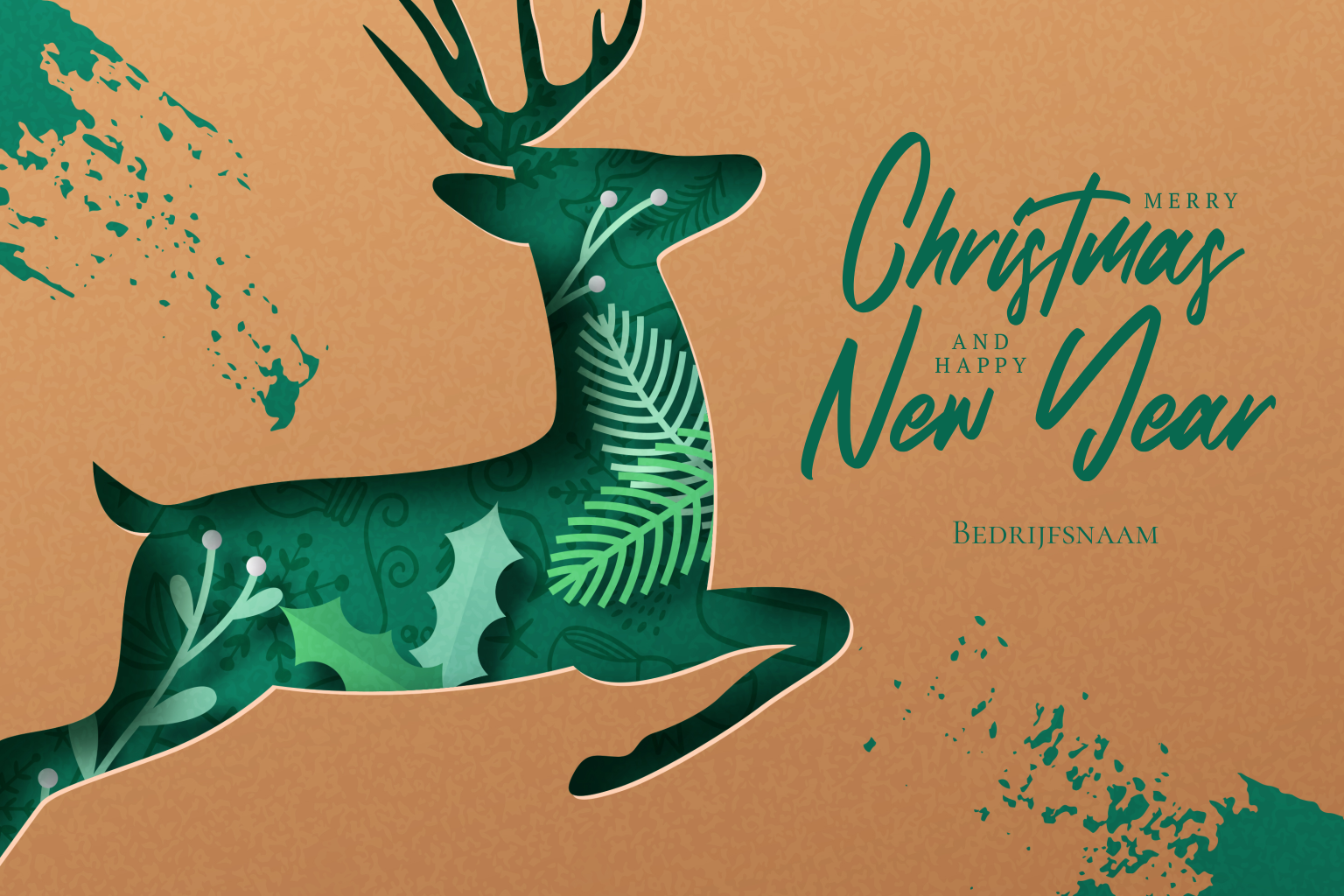 Een kerstkaart met eco thema: op de voorzijde staat een afbeelding van een groen hert, geknipt uit kraftpapier. Een feestelijk ontwerp met groen tintje. Pas deze kaart zelf aan in onze editor.