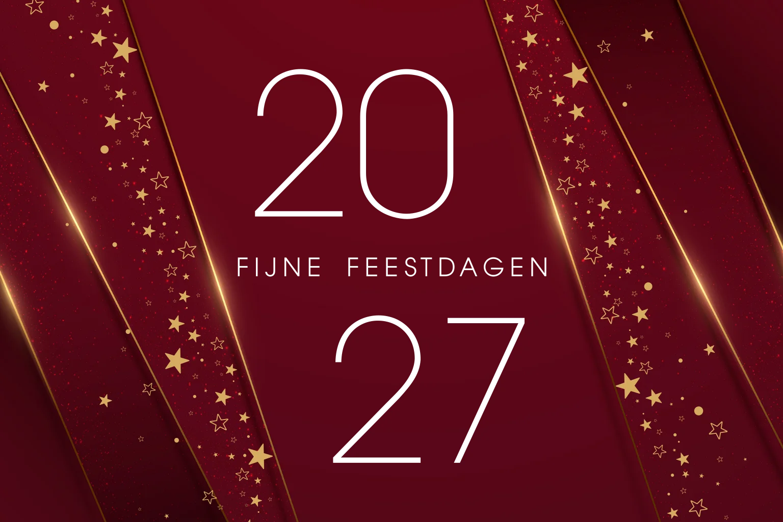 Chique kerstkaart in dieprood met schuin geplaatste goudkleurige lijnen en het jaartal 2027 in echt goudfolie. Voeg een vleugje elegantie toe aan uw kerstwensen met onze goudfolie ontwerpen, waarin u ruimte hebt om uw logo en persoonlijke boodschap toe te voegen.