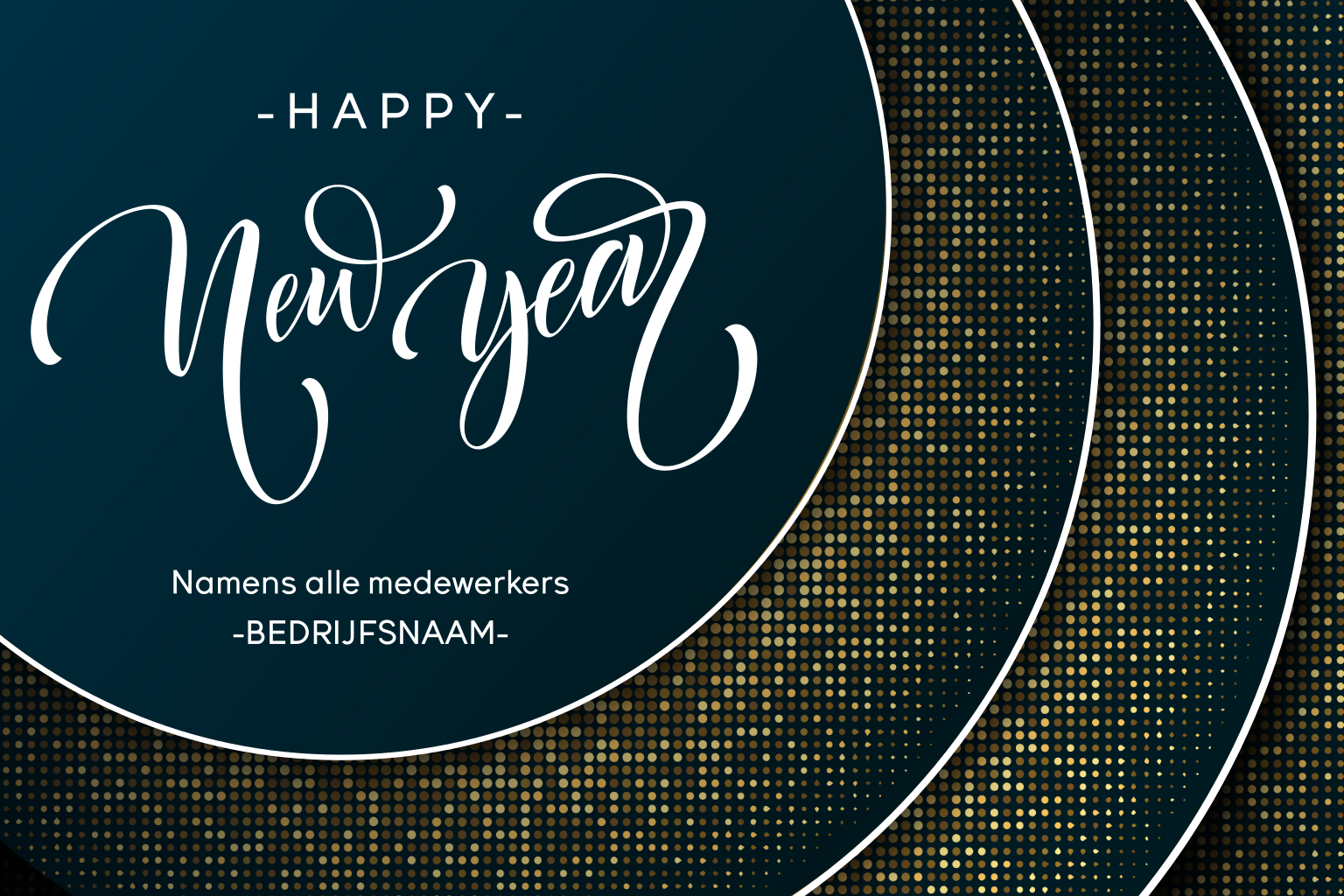Op zoek naar een stijlvolle kerstkaart die gegarandeerd de aandacht trekt? Kijk niet verder! Deze diepblauwe, chique kerstkaart is versierd met prachtige abstracte gouden cirkels. In een prachtige typografie staat de boodschap 'Happy New Year' prominent in de grootste cirkel geschreven. Verhoog de feestvreugde en stuur deze prachtige kaart om het nieuwe jaar in stijl te vieren!