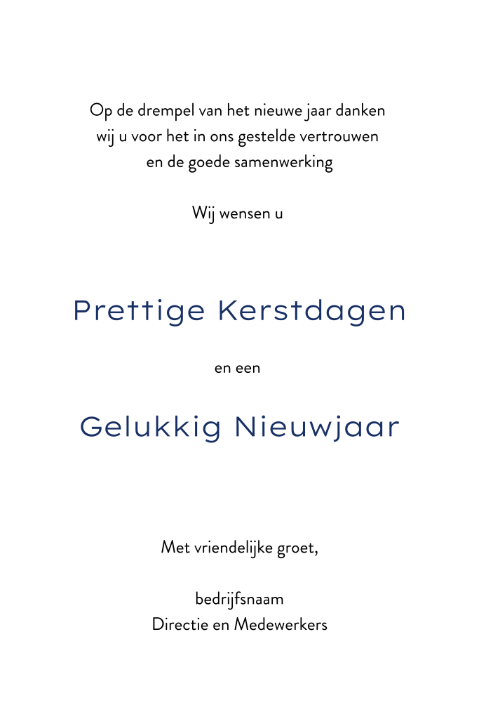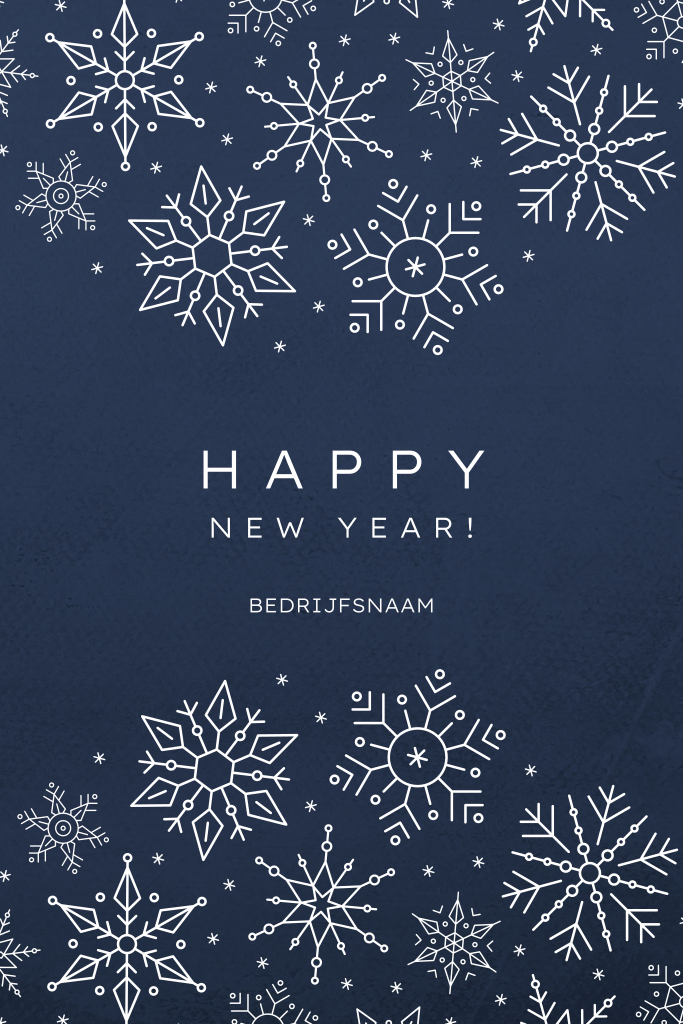 Zakelijke kerstkaart met donkerblauwe achtergrond en diverse, grafische ijssterren in wit en goudfolie. Bestel een drukproef om de kaart in het echt te bekijken.