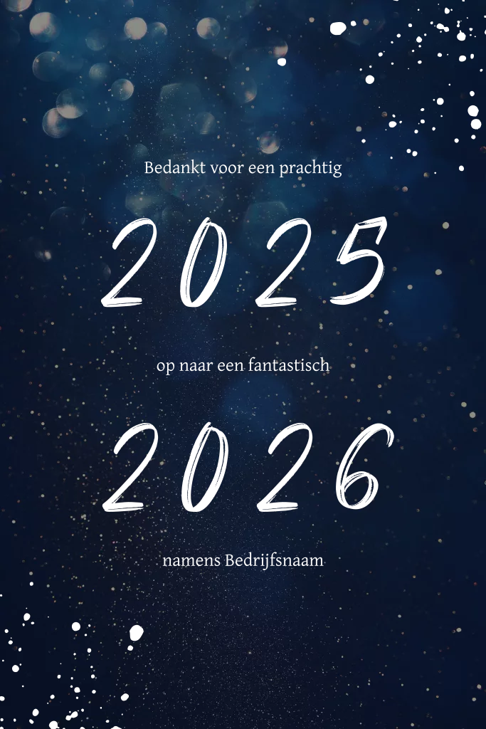 Wens uw zakelijke contacten of werknemers een mooi nieuwjaar toe met deze donkerblauwe nieuwjaarskaart met goudfolie. De spetters maken deze kaart tot een feestelijk geheel. U kunt zelf de teksten aanpassen met onze editor.
